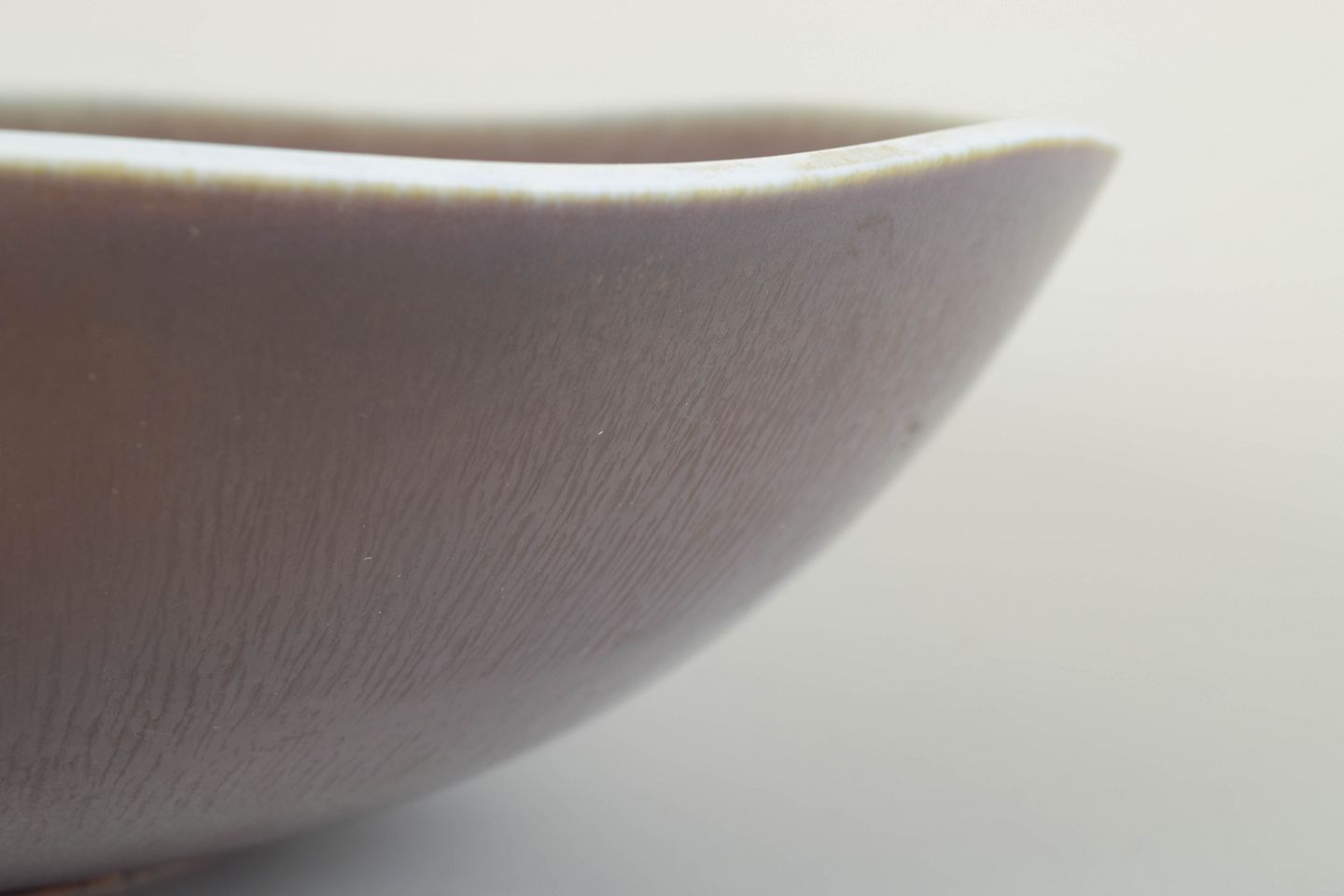 Elegant hånddrejet stor stentøjsskål med karakteristisk harepelsglasur i brunlige toner og fint markeret hvid kant. Formen er blødt organisk og afbalanceret, som kendetegnende for Fribergs mestrede proportioner og subtile overflader. Signeret ‘Friberg’ med Gustavsbergs værkstedsmærke under bunden.
