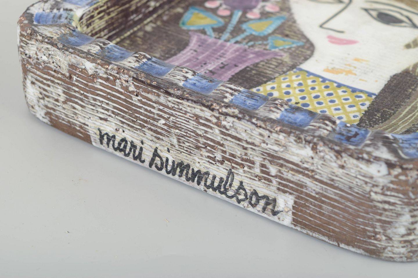 Rektangulært relief-fad i chamotte-stentøj med håndmalet motiv af kvinde og vase i lilla, blå og gule toner. Designet med Simmulsons karakteristiske kombination af modernistisk stil og varm, humanistisk udtryksform.