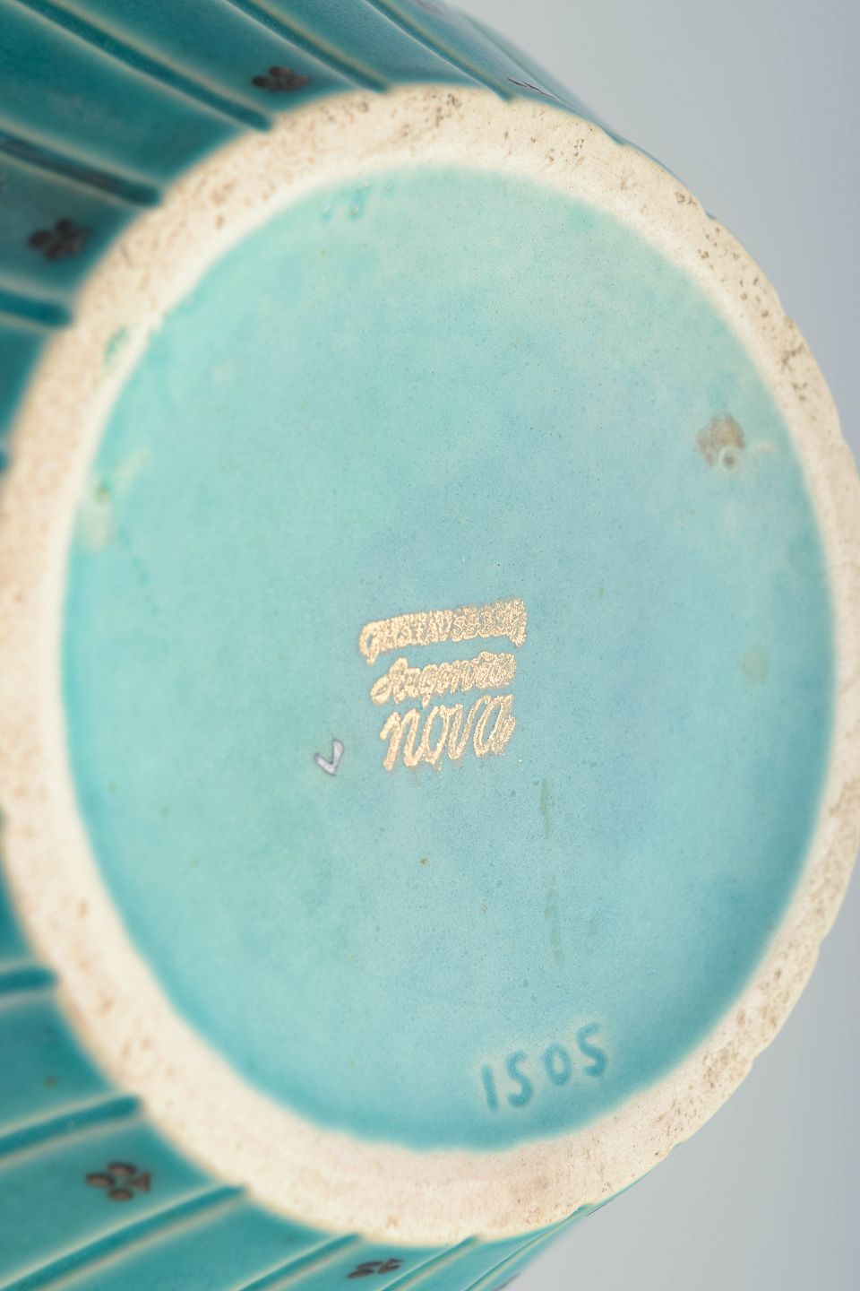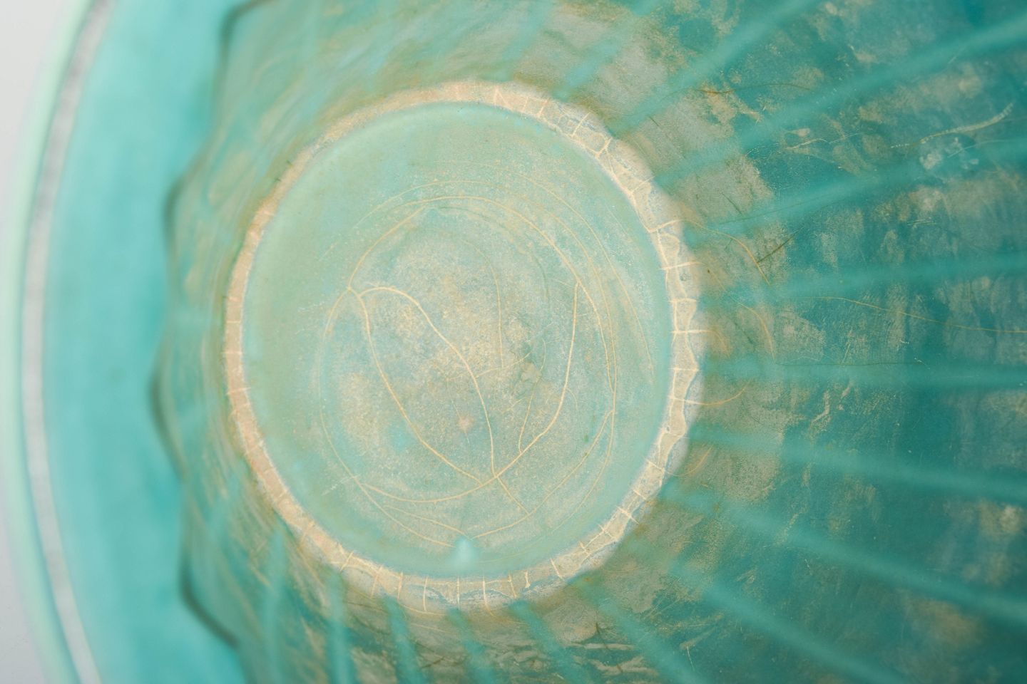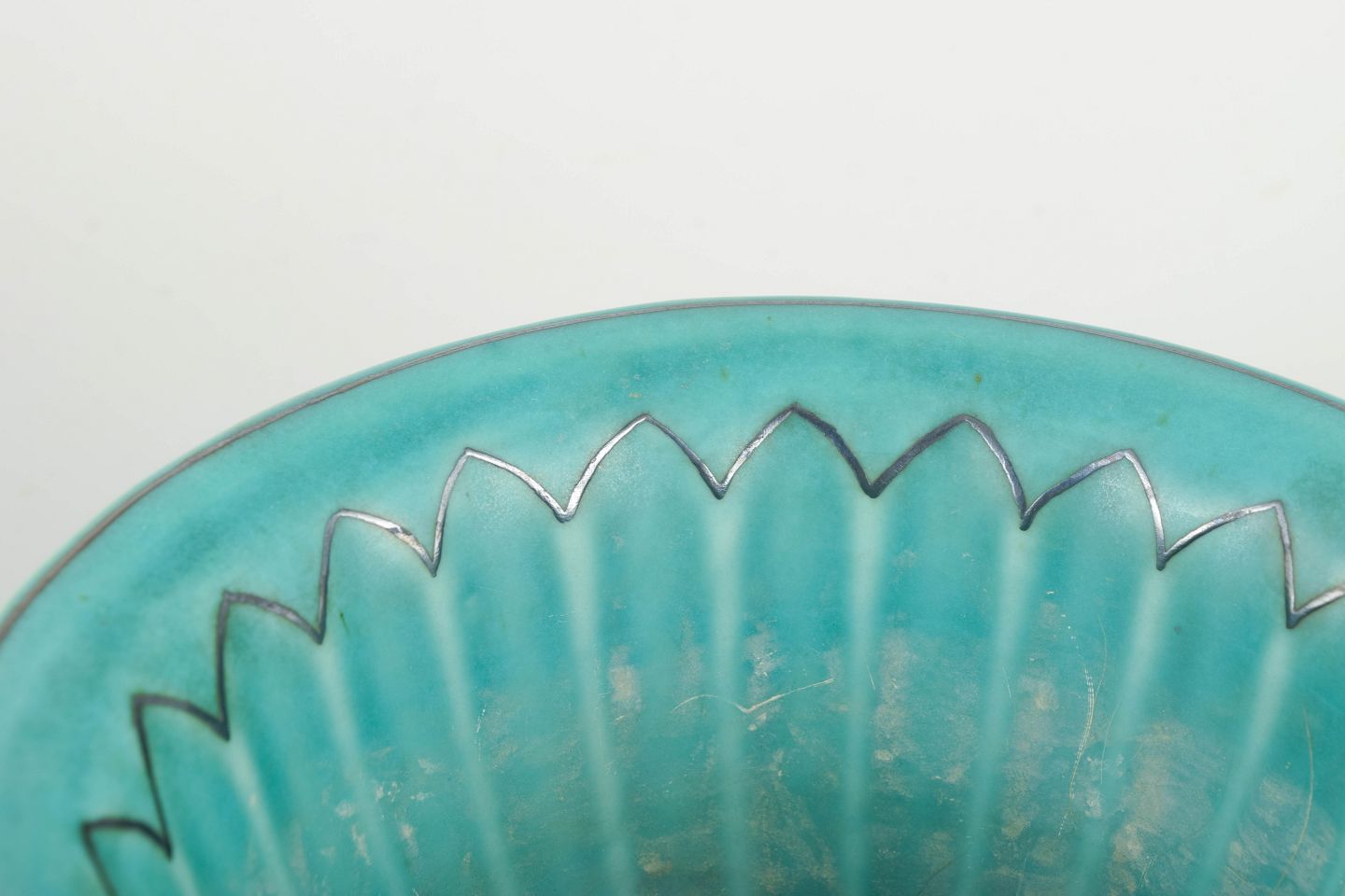 Stentøj med turkis glasur og indlagte sølvdetaljer. Dekoreret med lodrette rifler og små sølvindlagte blomster langs siderne samt scalloperet kant. Klassisk tidlig Argenta med tydelig art deco-formgivning. Let kalkbelægning i bunden.