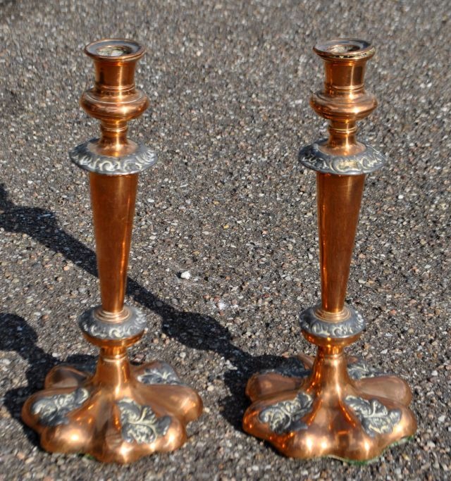 Et par engelske kobberstager med tin, 19. årh. H.: 30,5cm.
