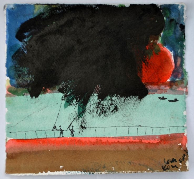 Kühl, Lena (1950 -) Danmark: Fiskere, 2001. Akvarel på papir. Signeret: Lena Kühl 2001. H: 18 cm. B: 19 cm.