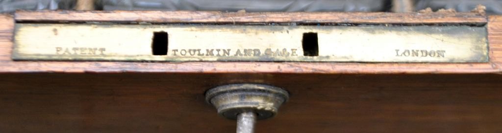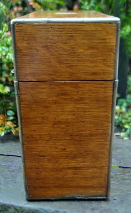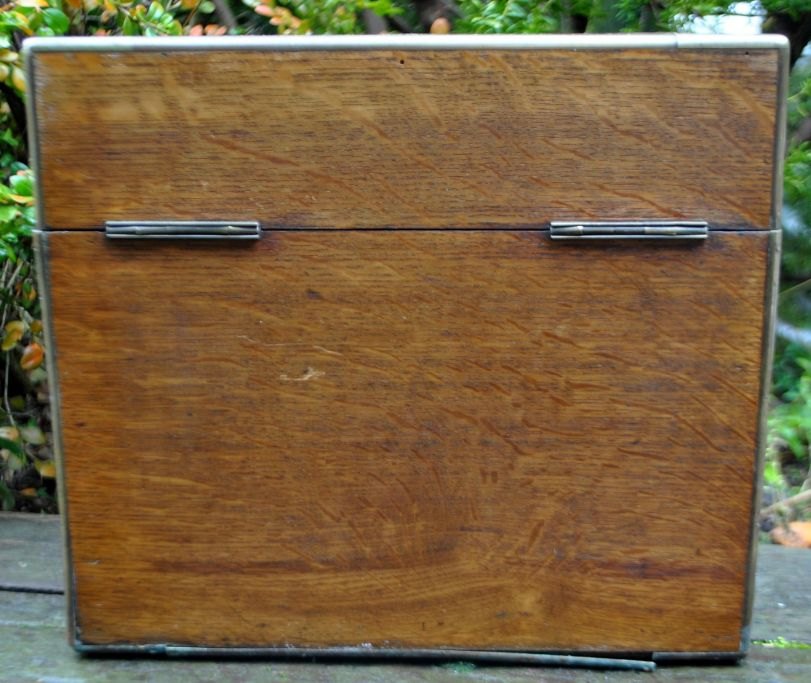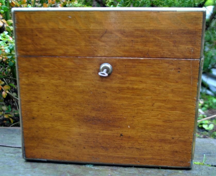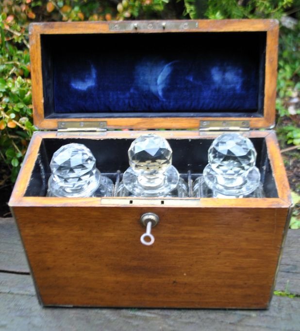 Engelsk tantalus med tre krystal karafler, 19. årh. Poleret egetræs skrin med lås og nøgleskilt. Indeholdende tre karafler med prop. Stemplet. H: 27 cm. L: 30 cm.