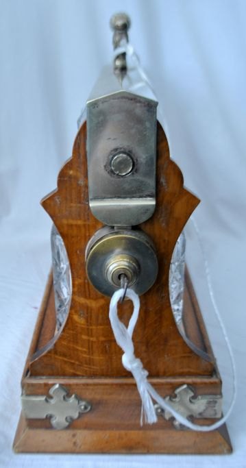 Engelsk tantalus med tre karafler, 19. årh. Poleret egetræ. Med forsølvede beslag og lås med nøgle. H: 32 cm. L: 41 cm.