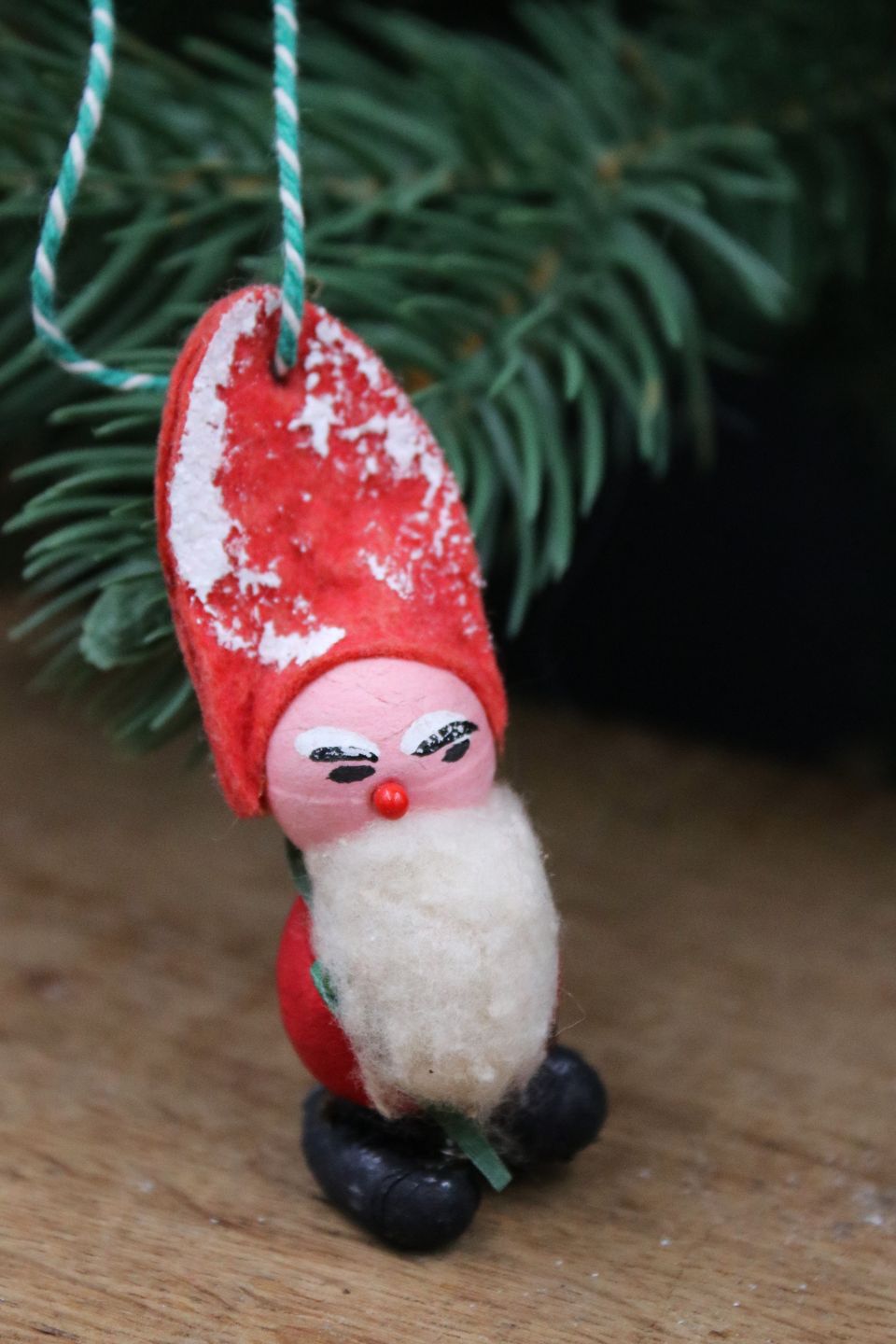 Gammel julemand lavet i vat og filt til at hænge på juletræet.