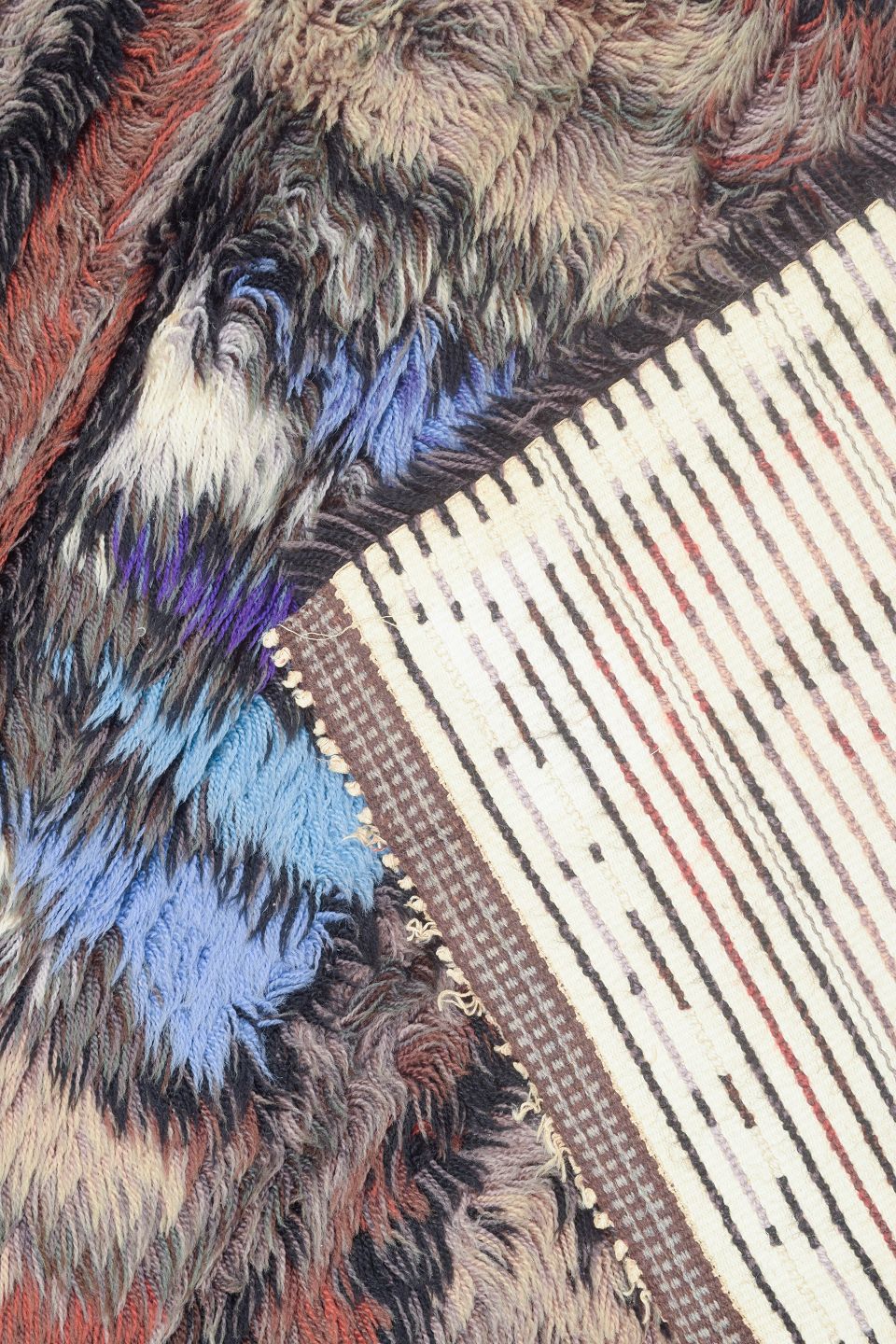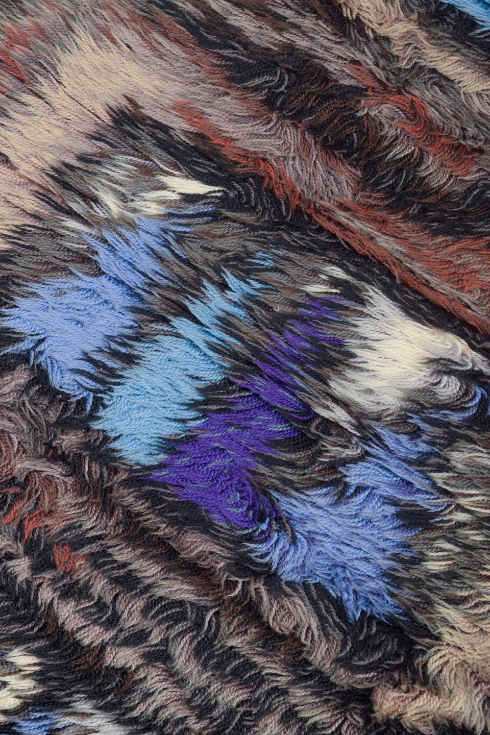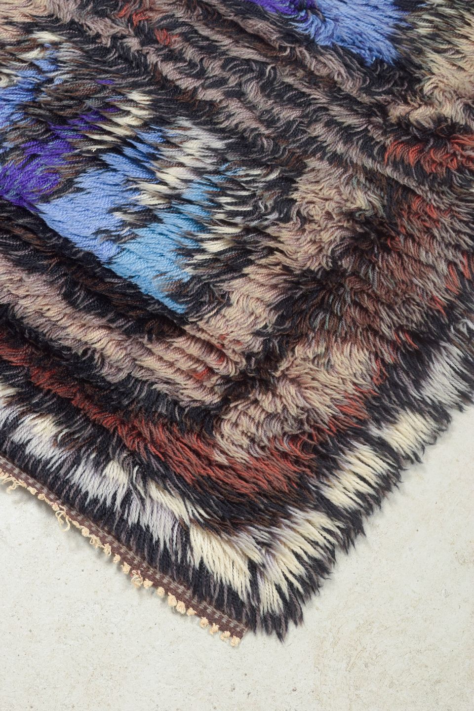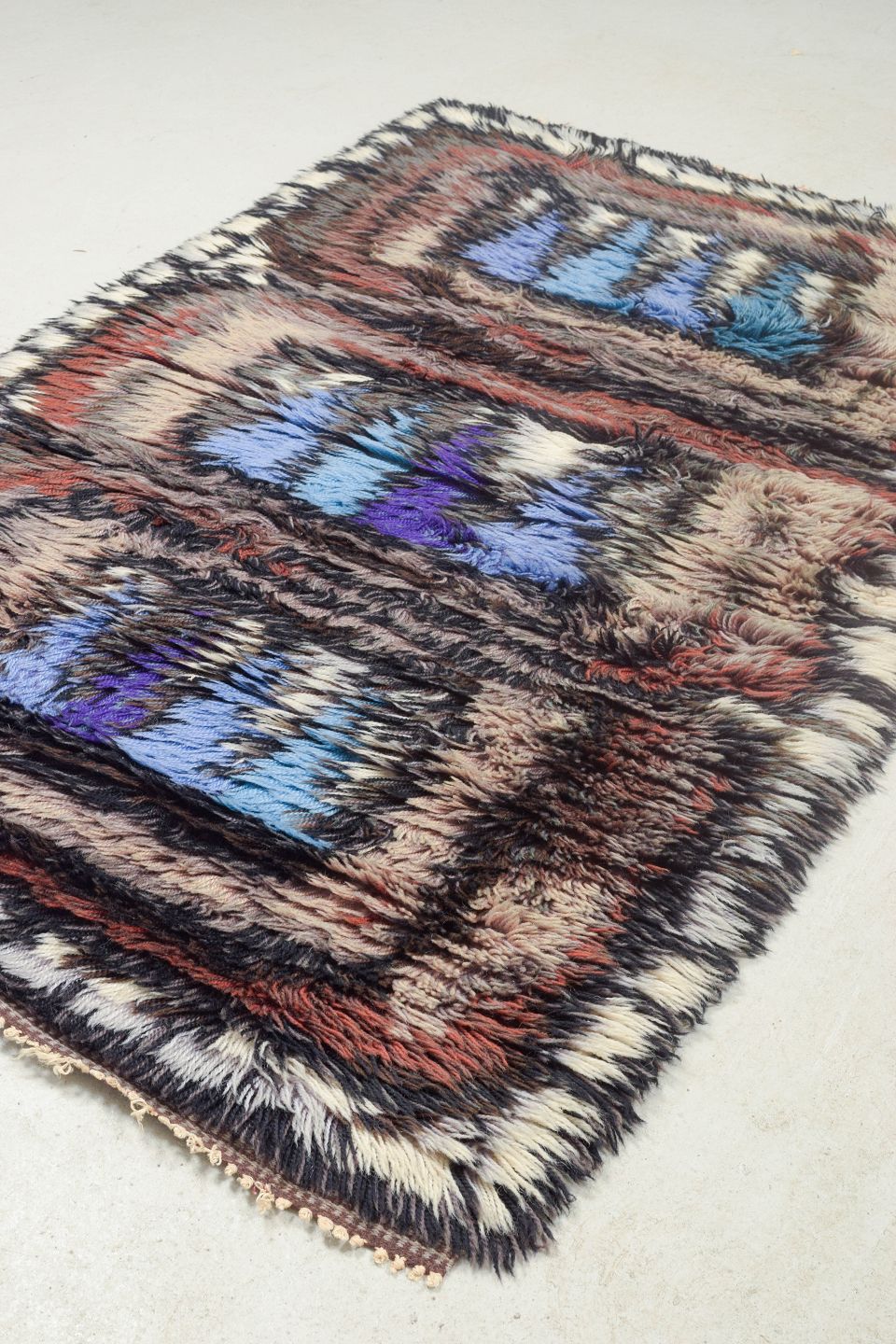 Håndknyttet rya-tæppe i ren uld med geometrisk mønster i blå, lilla, brunlige og beige toner. Et karakteristisk design fra perioden, hvor kontraster og rytmiske former blev brugt til at skabe dybde og bevægelse i tekstilet.