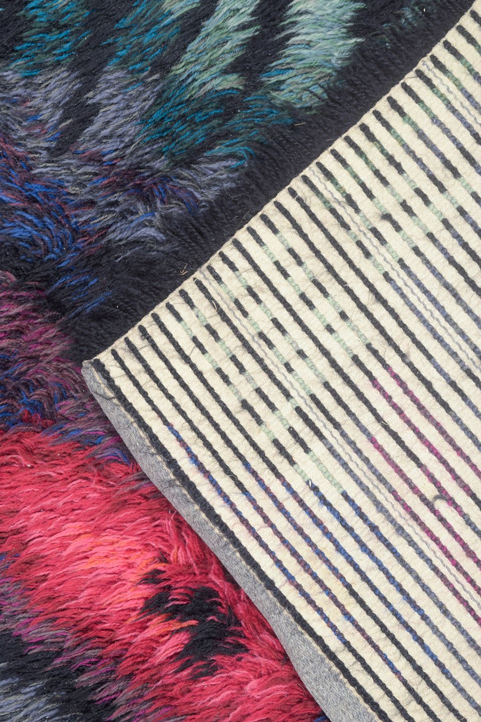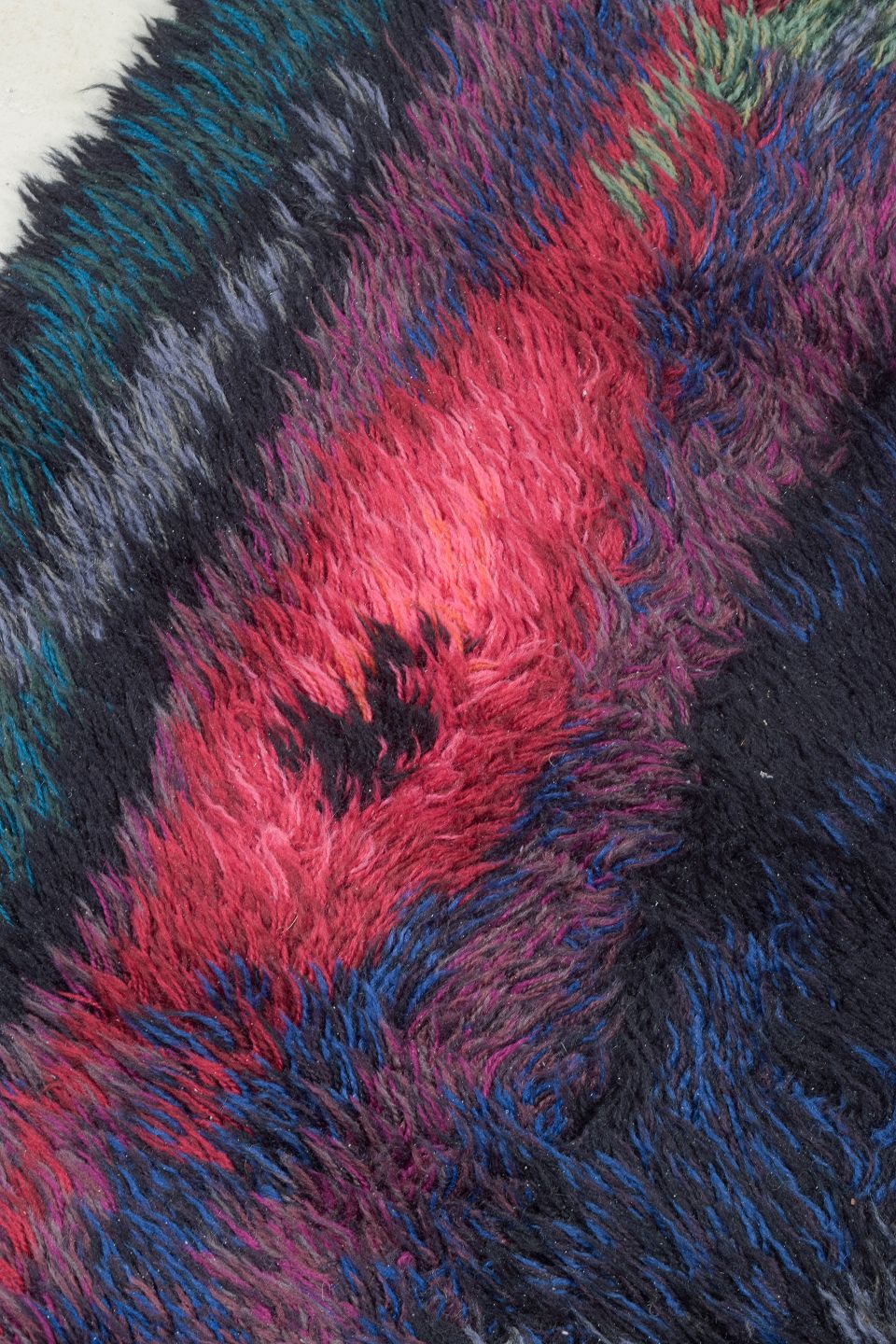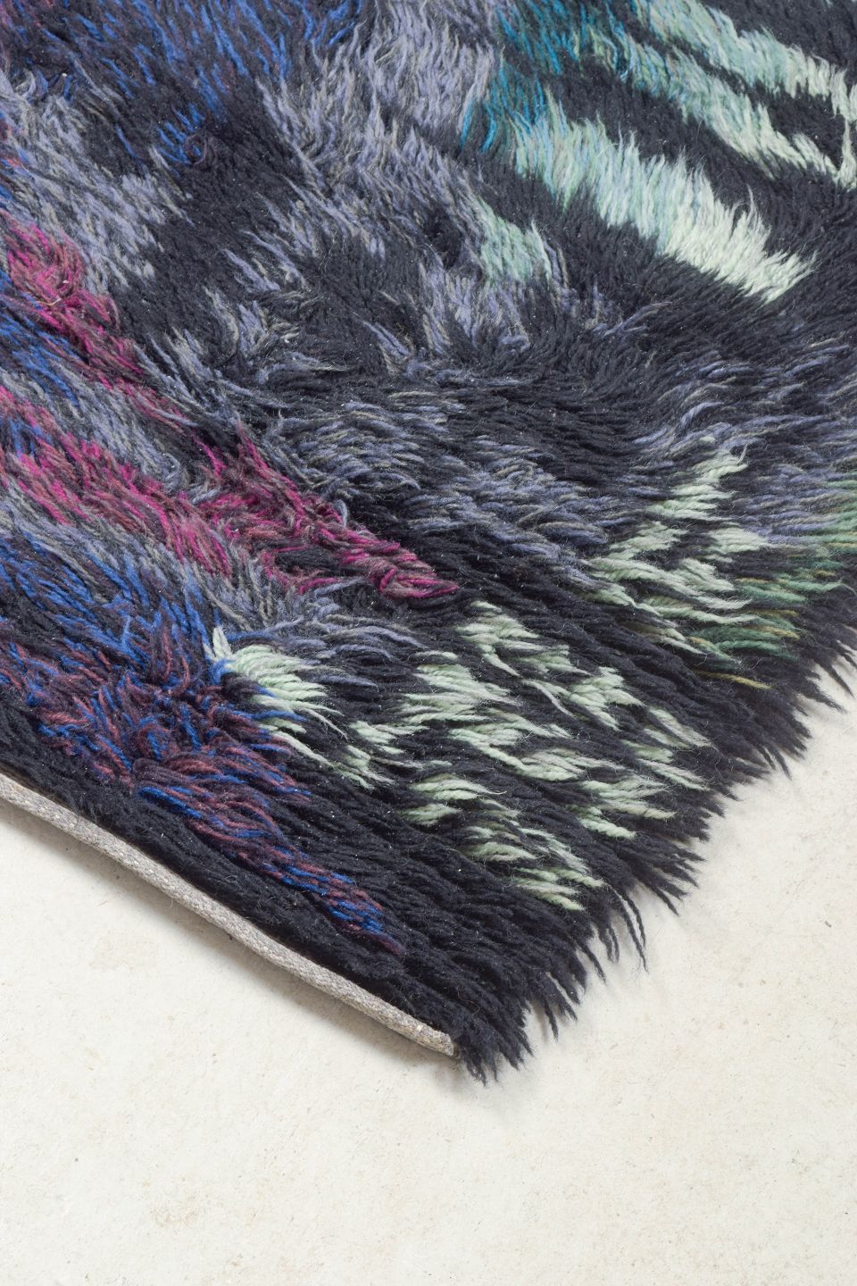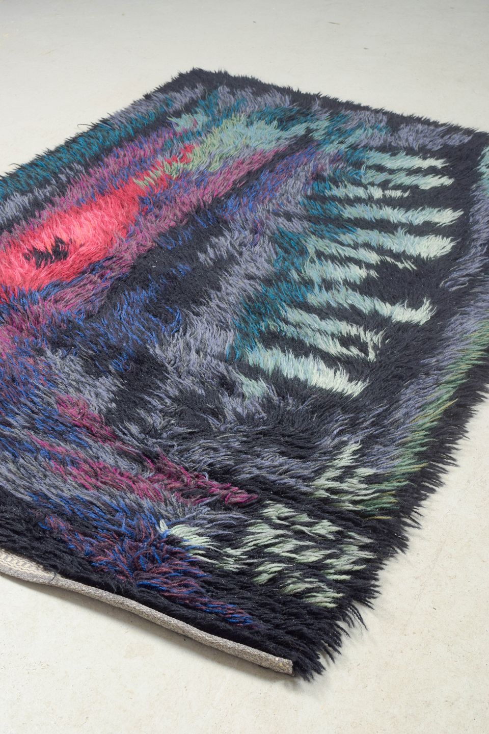 Håndknyttet rya-tæppe i ren uld designet af Ingrid Starling. Et ekspressivt og farvestærkt værk med abstrakt komposition i dybe blå, turkise, grønne og pink toner. Tæppet udviser den kunstneriske frihed og farveeksperimentering, der prægede svensk tekstilkunst i perioden.