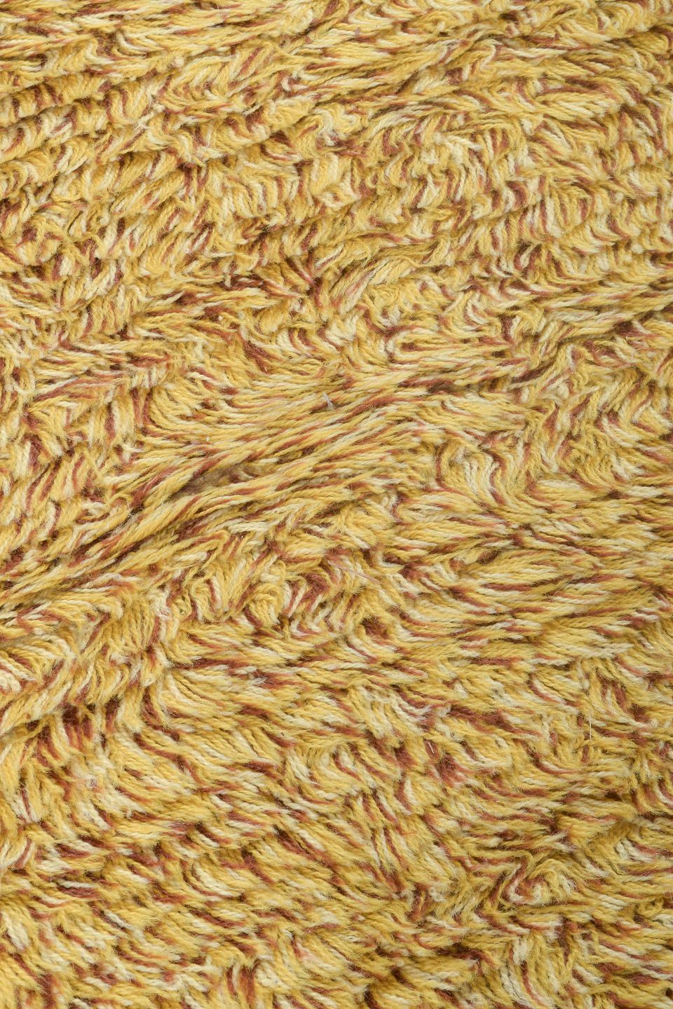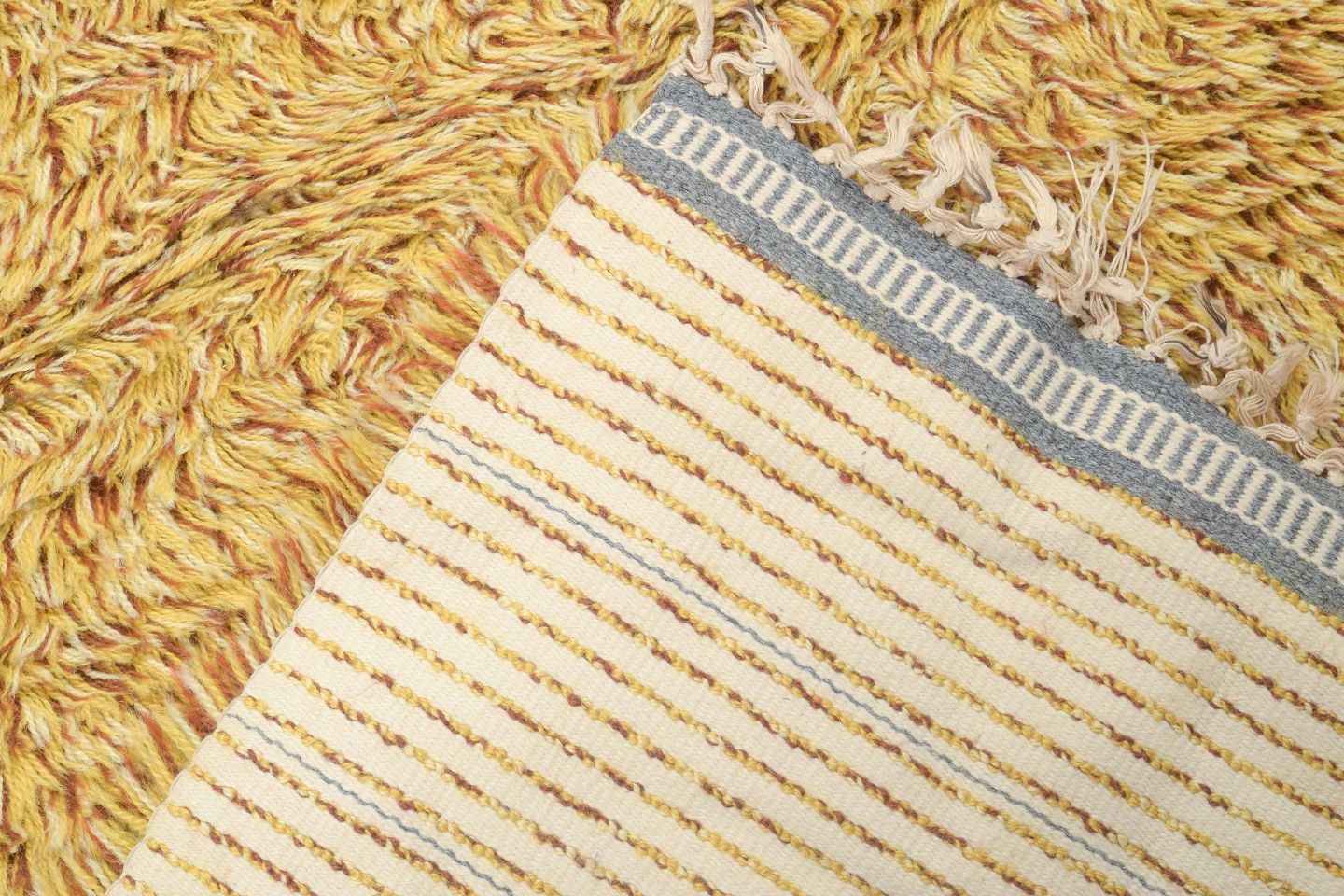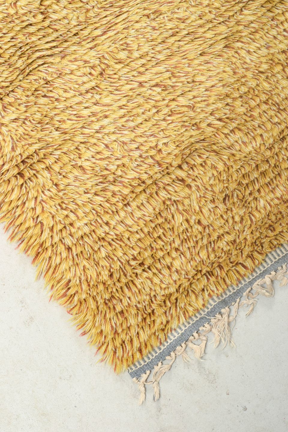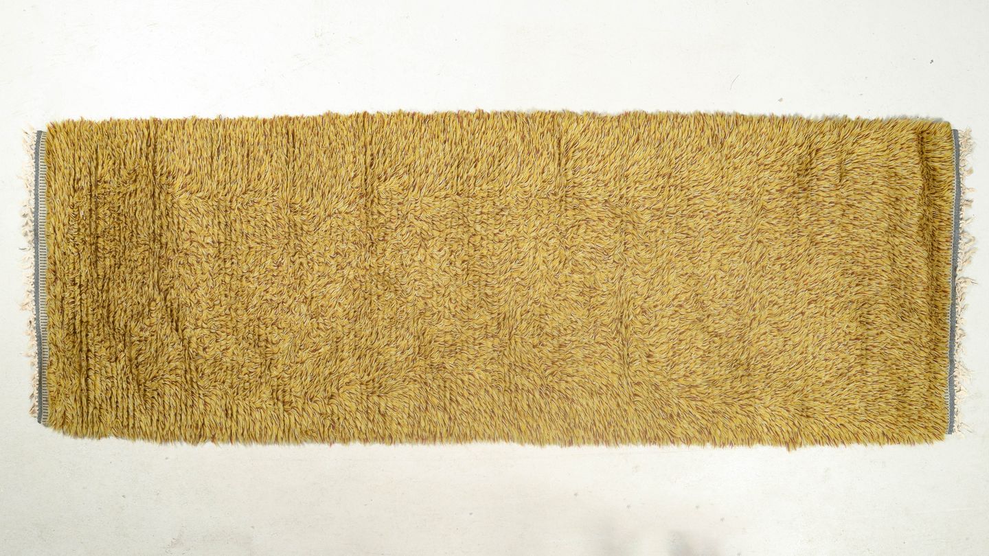 Håndknyttet rya-løber i ren uld i gylden sennepsgul nuance. Et elegant og tidstypisk tekstil med tæt luv og enkel farve, velegnet til både gangarealer og som dekorativt indslag i moderne indretning.