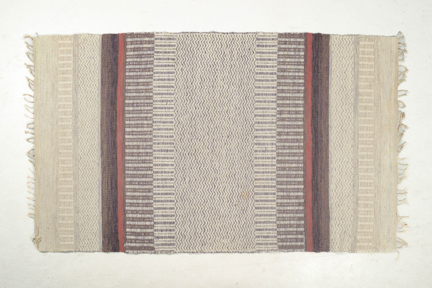 Håndvævet tæppe i ren uld med geometrisk mønster i naturlige nuancer af beige, brun og rødlige toner. En klassisk repræsentant for den skandinaviske tekstiltradition, hvor enkelhed og struktur går hånd i hånd med funktionalitet og varme.
