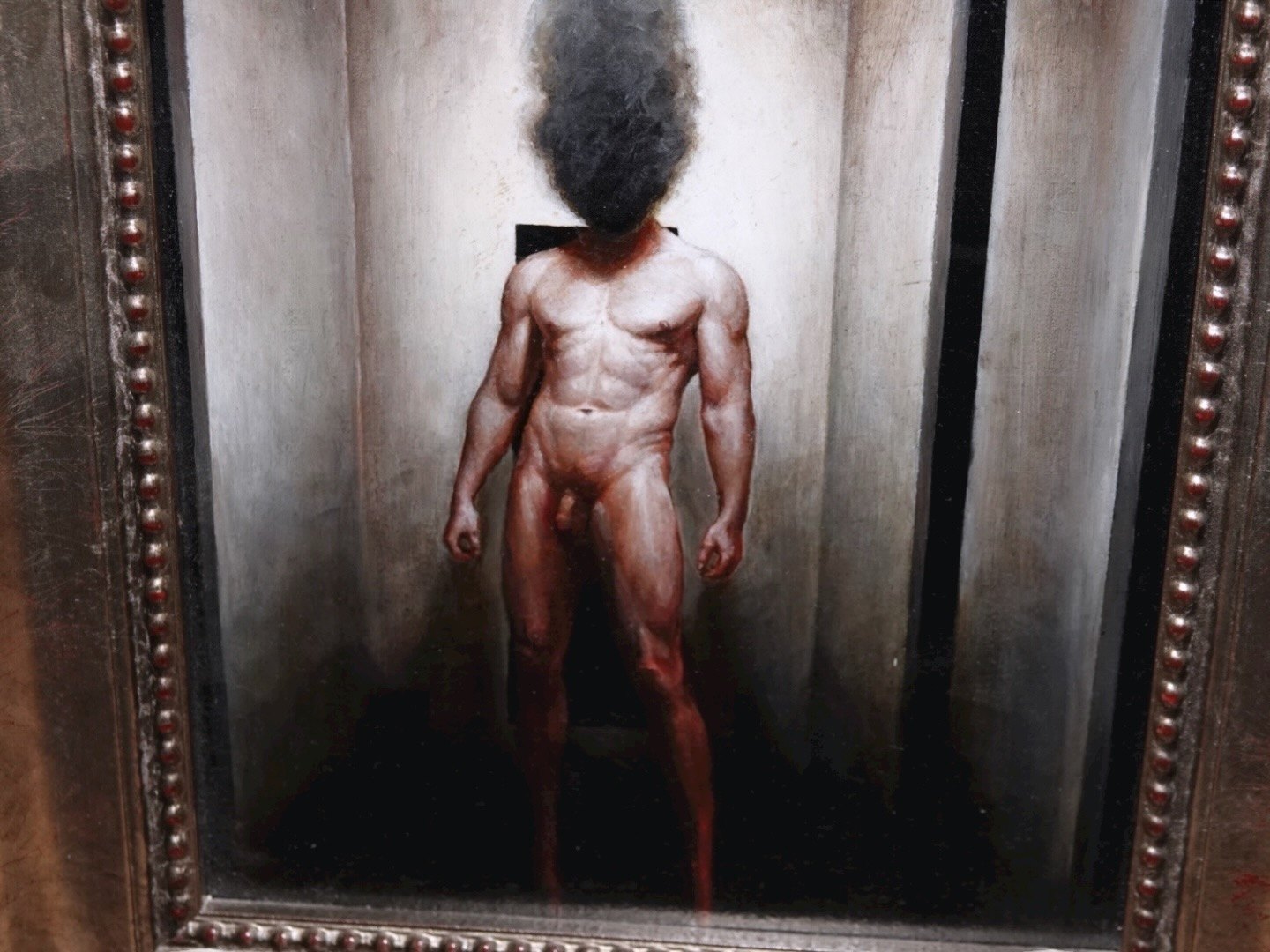 Akryl og oliemaleri af nøgen mand i bred sølvramme fra 2010.