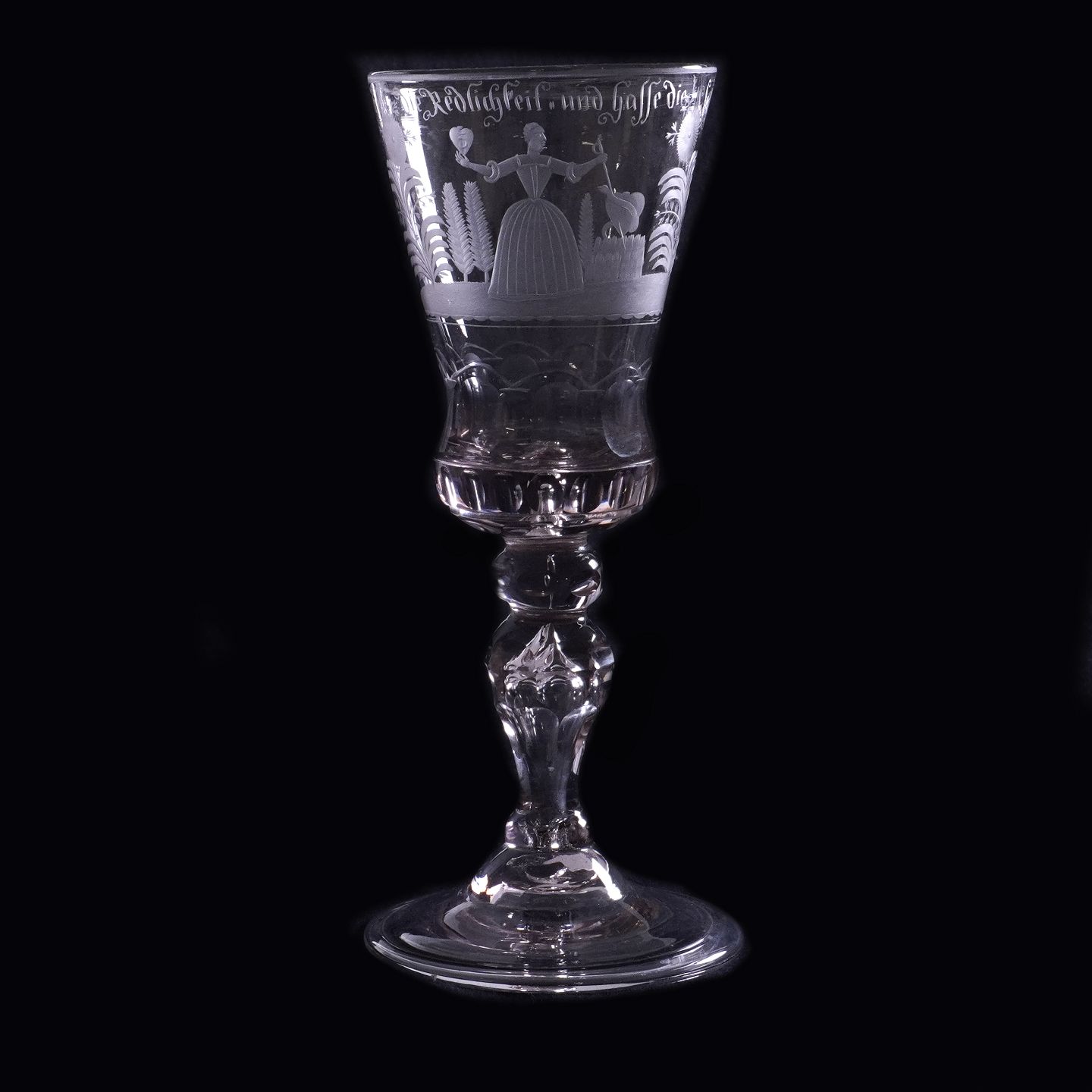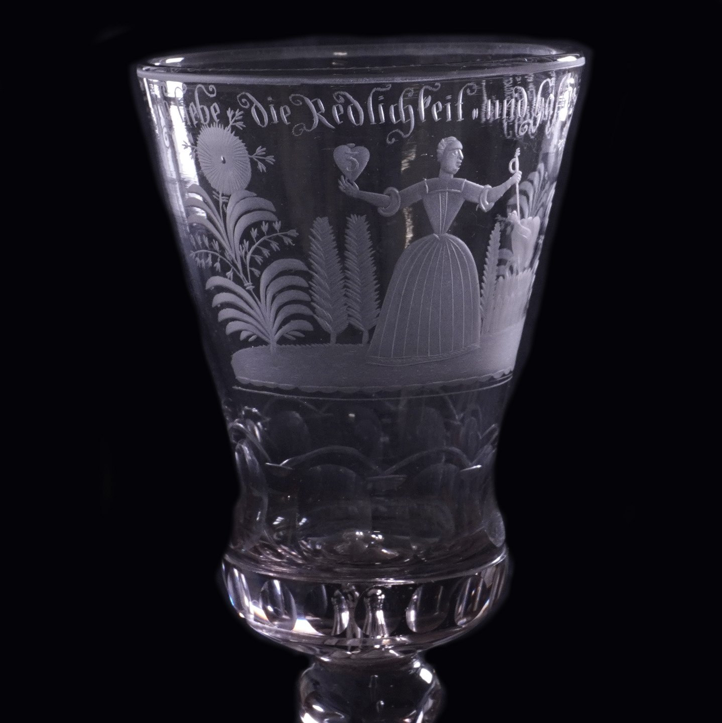 Tysk glaspokal med gravering "Ich liebe die Redlichkeit und hasse die Falschheit". Sachsen eller Dresden ca. år 1740. H: 21,5cm |