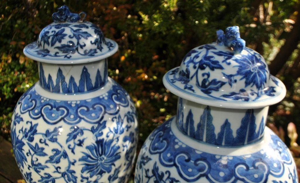 Par kinesiske låg krukker, blå/hvidt porcelæn, 19. årh. Håndmalet dekoration i form af blomster og mønstre. H: 46 cm.