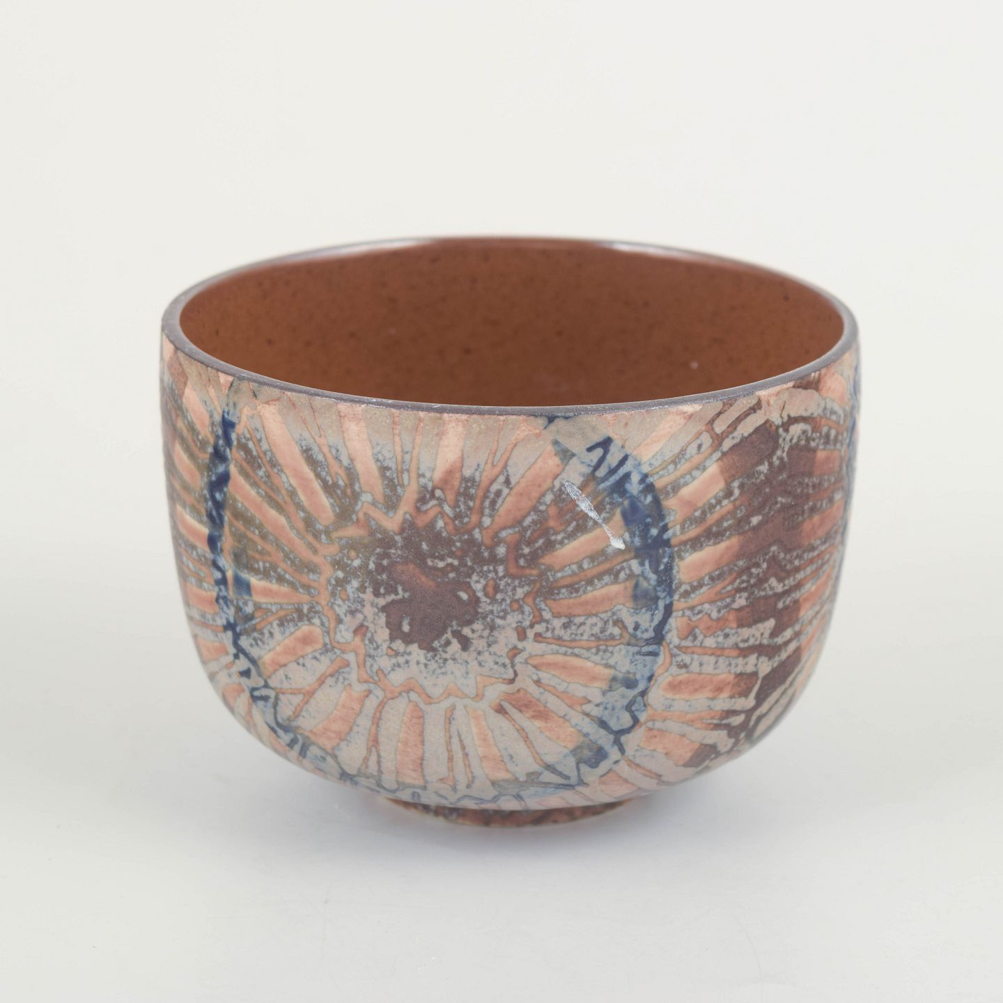 Dekorativ skål i stentøj med karakteristisk hånddekoreret glasur i blå, brunlige og lyse toner, udført i relief med organisk solmotiv. Et typisk eksempel på Thorssons arbejde for Royal Copenhagen i perioden, hvor han eksperimenterede med tekstur og naturinspirerede mønstre.