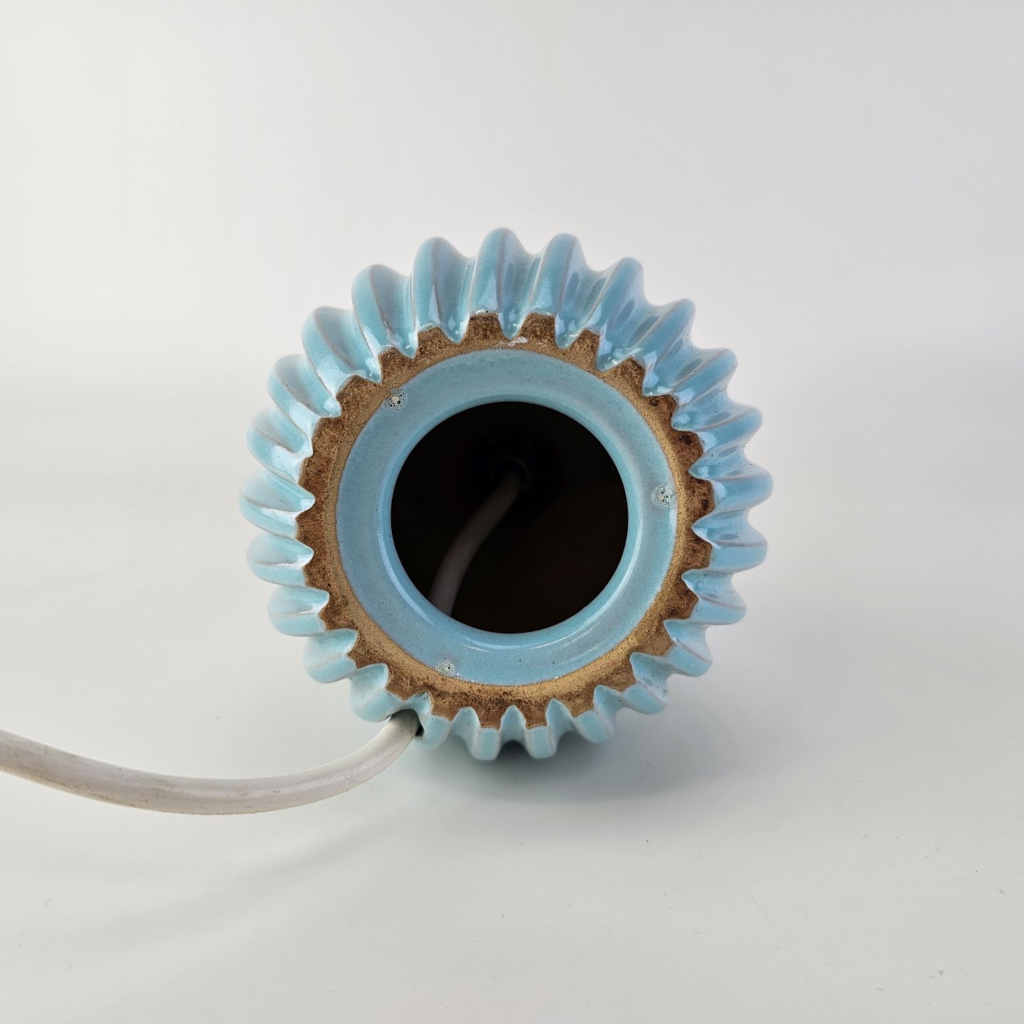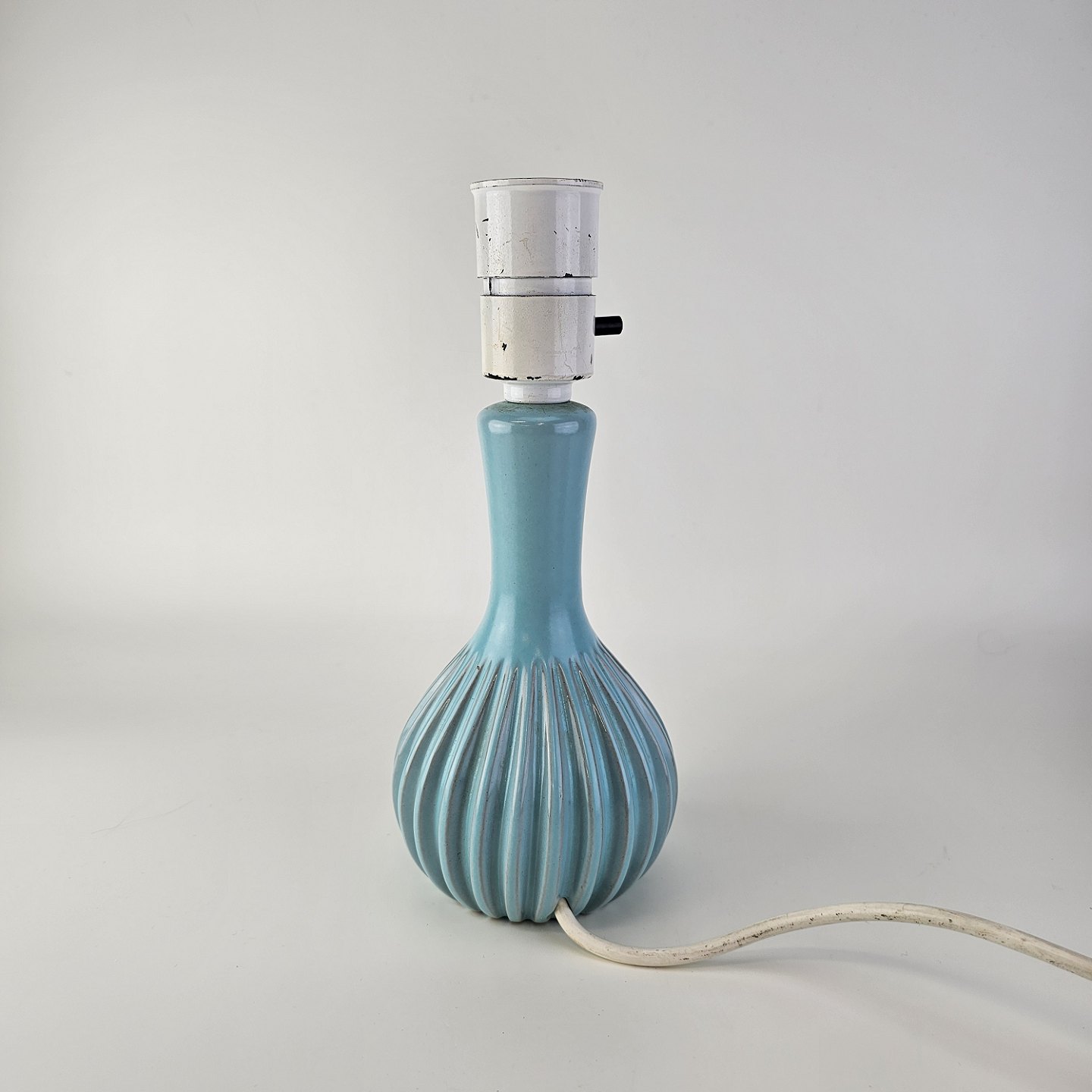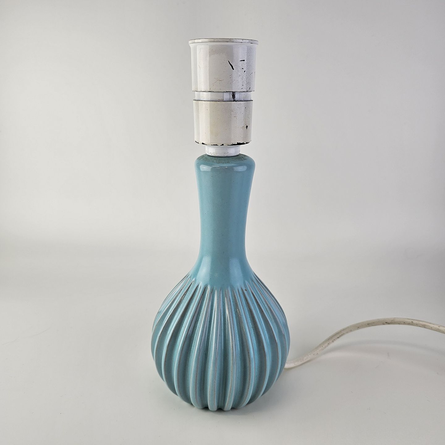 Rund bordlampe i rillet grønblå keramik med hvid fatning