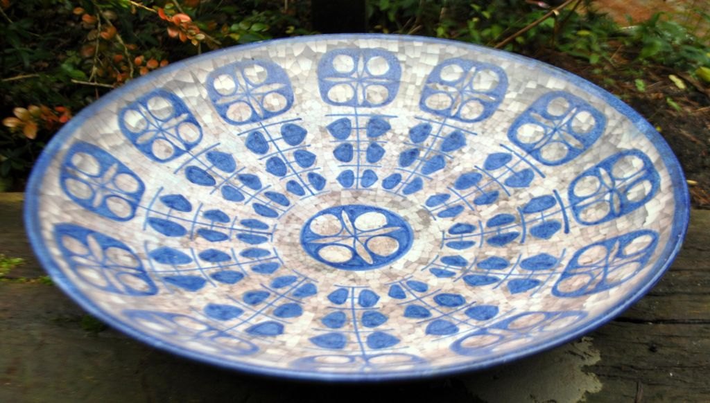 Michael Andersen & Søn keramik fad nr. 4106-3, Bornholm, Danmark, efter 1930. Dekoreret i blå/grå nuancer på mosaikbund. Signeret M S og stemplet med tre fisk. Dia: 40 cm.