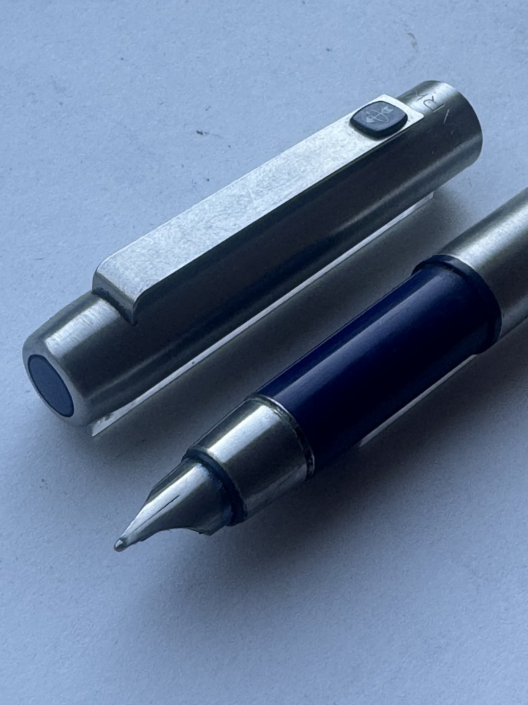 Parker 25 fyldepen i stål fremstillet fra midt i 1970’erne i England. Fremstår i god og skriveklar stand, når der bliver indsat en ny refill blækpatron. 13,2 cm lang.