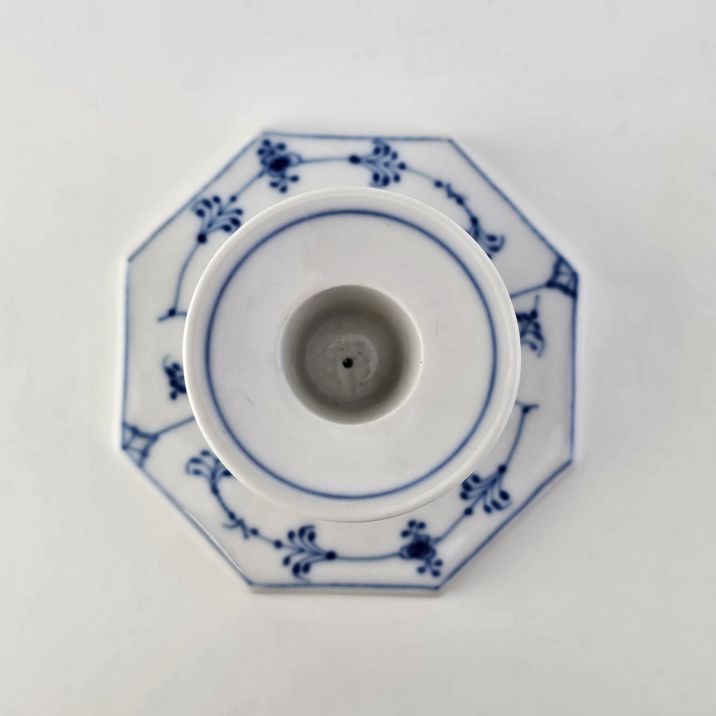 Musselmalet er af kongeligt hvidt porcelæn, dekoreret med mønster af blå ranker og blomster