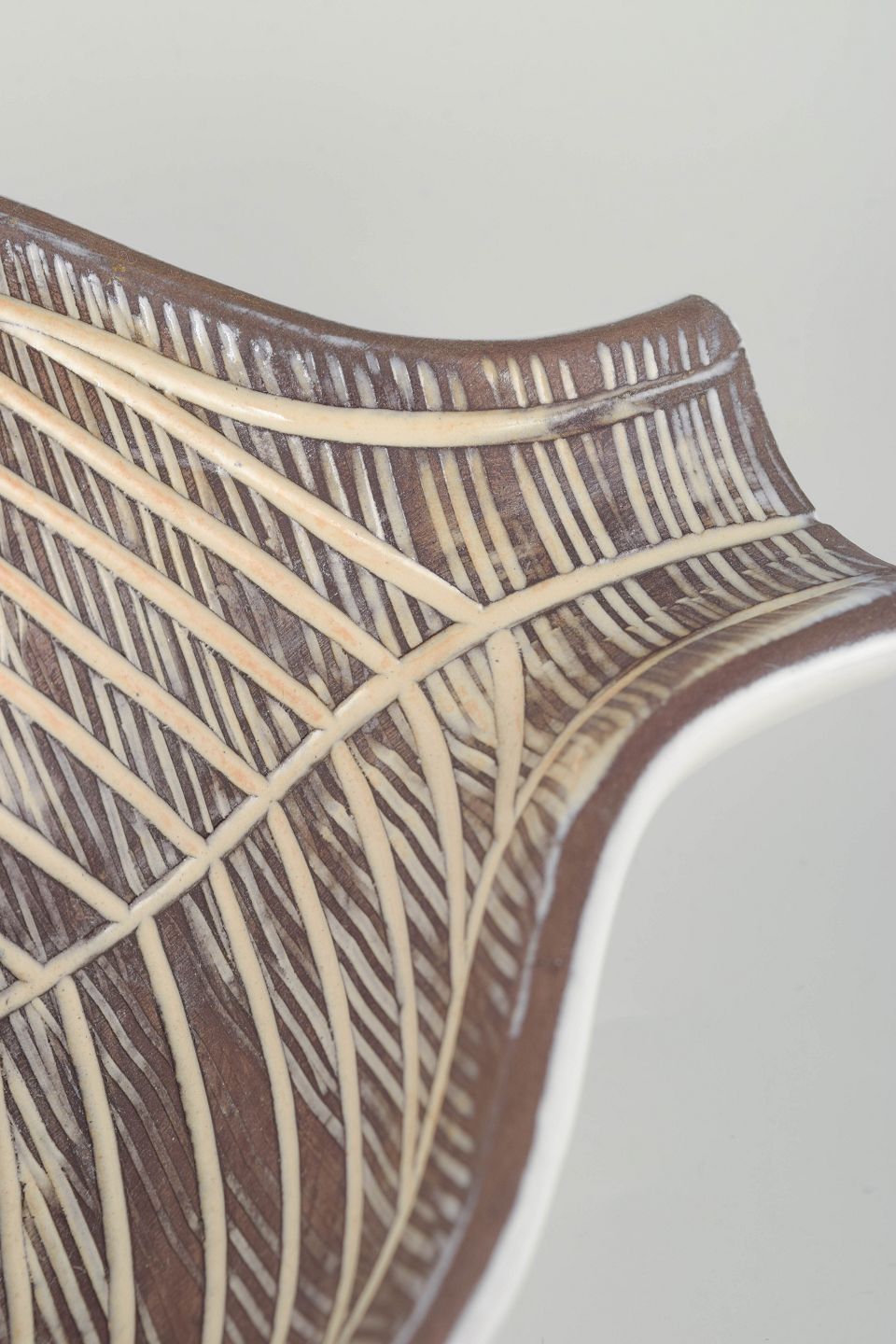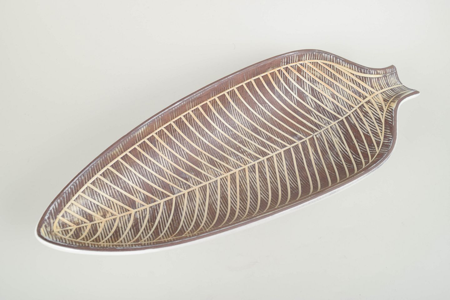 Meget stor, bladformet keramikskål dekoreret med Simmulsons karakteristiske indridset mønster i lyse toner mod brun baggrund. Håndmalet og elegant udformet med organiske linjer.