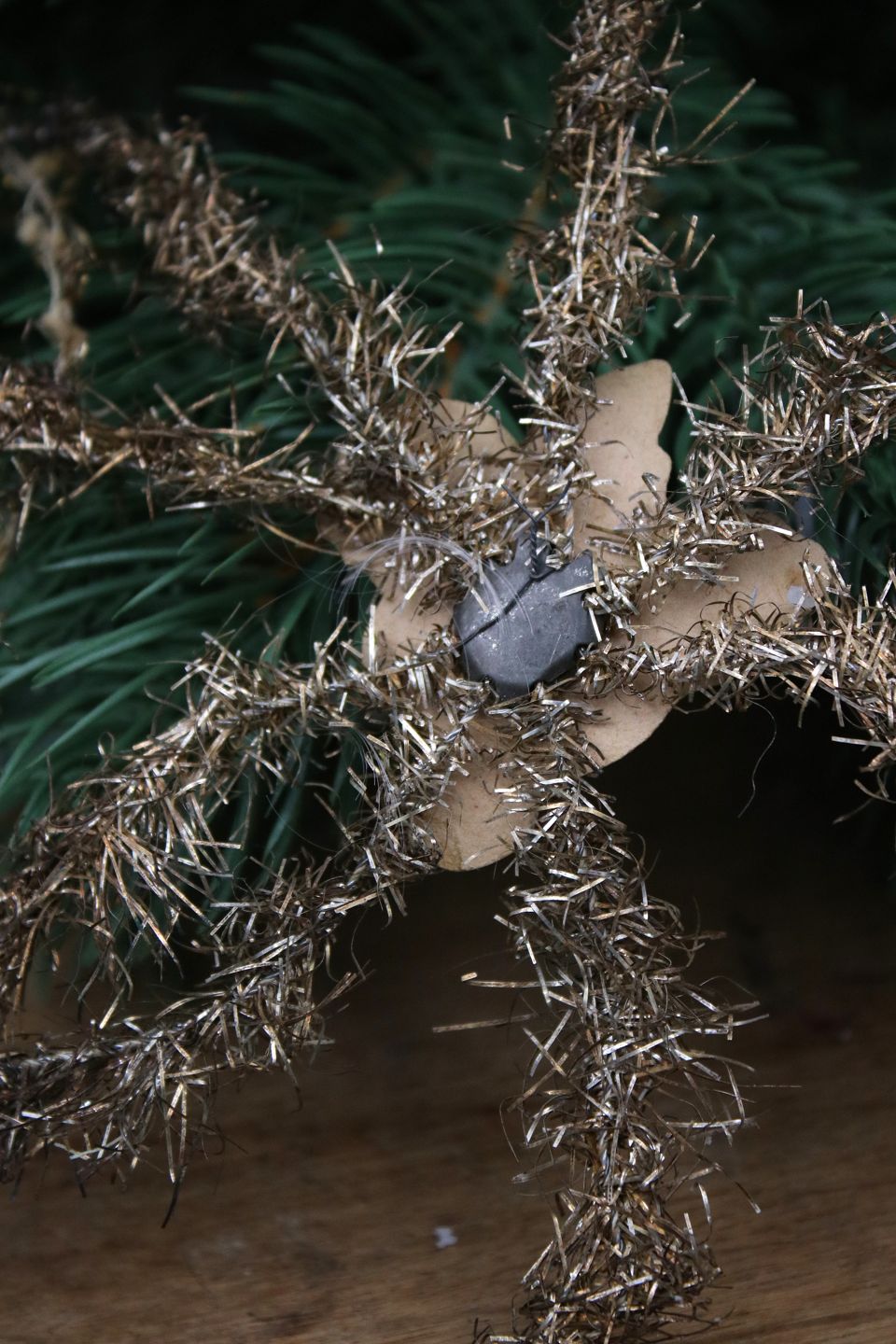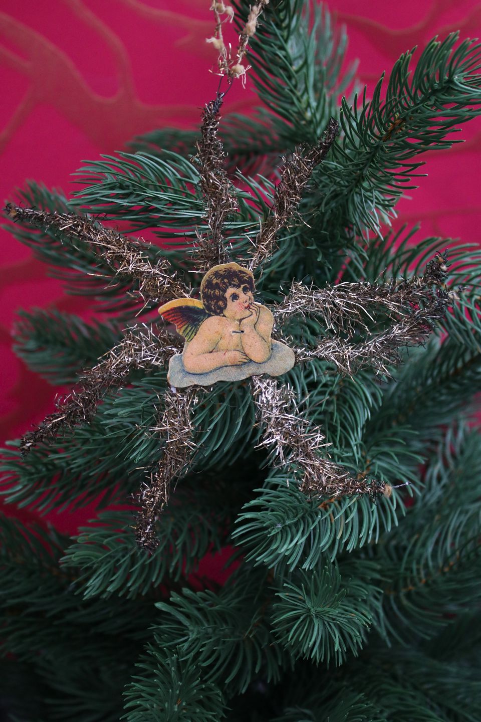 Antikt tinsel juletræspynt , engel i pap med sølv tinsel.