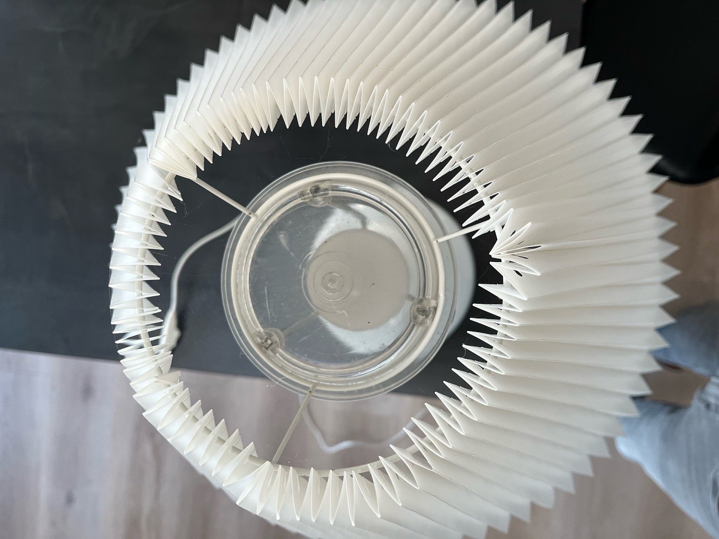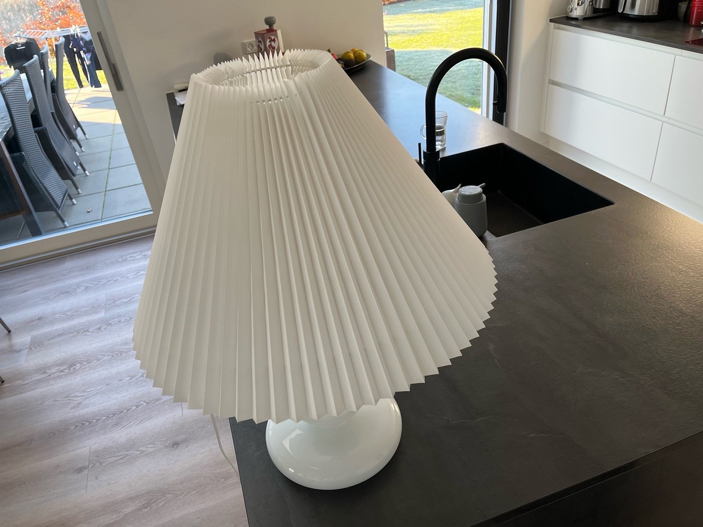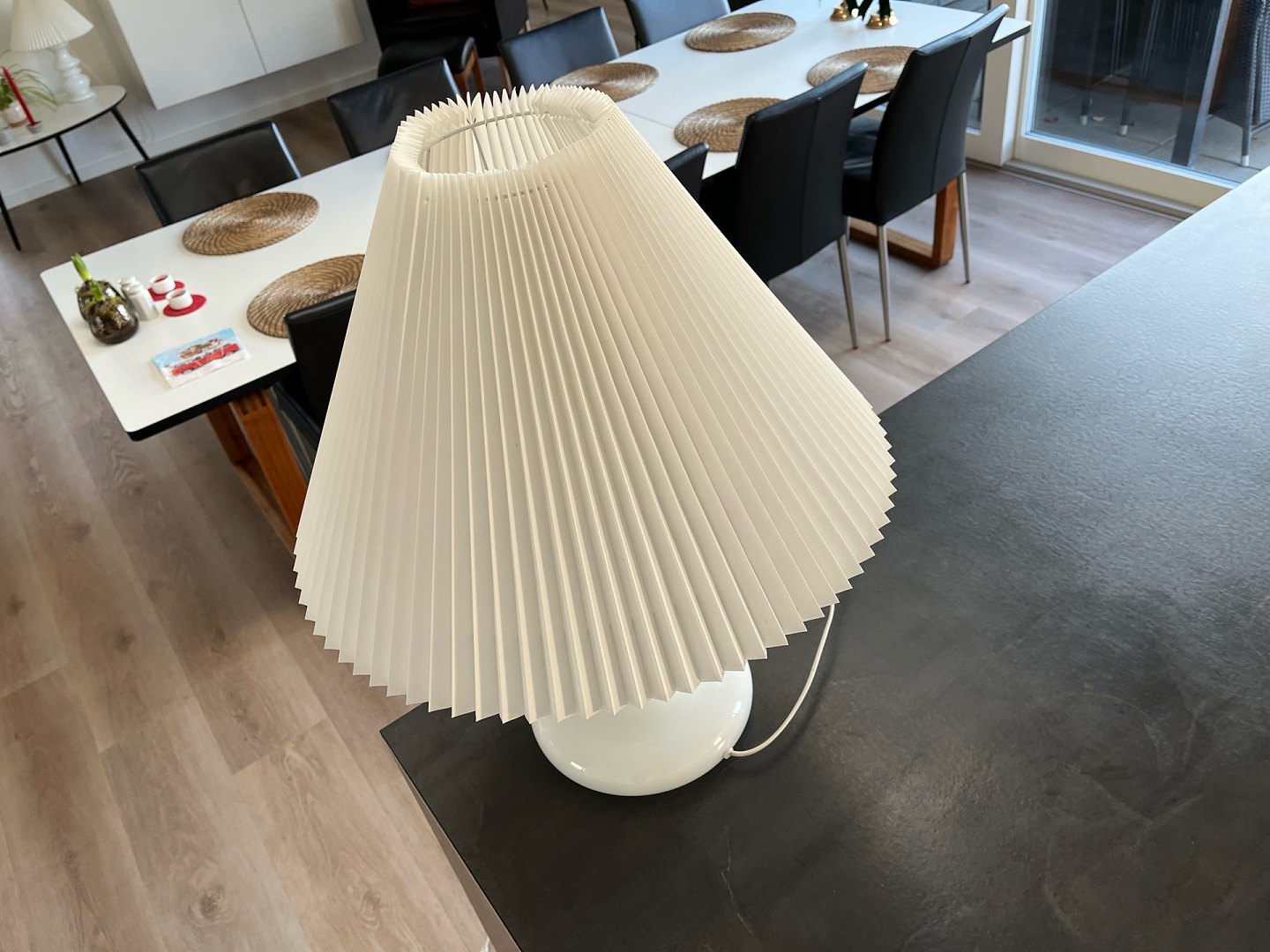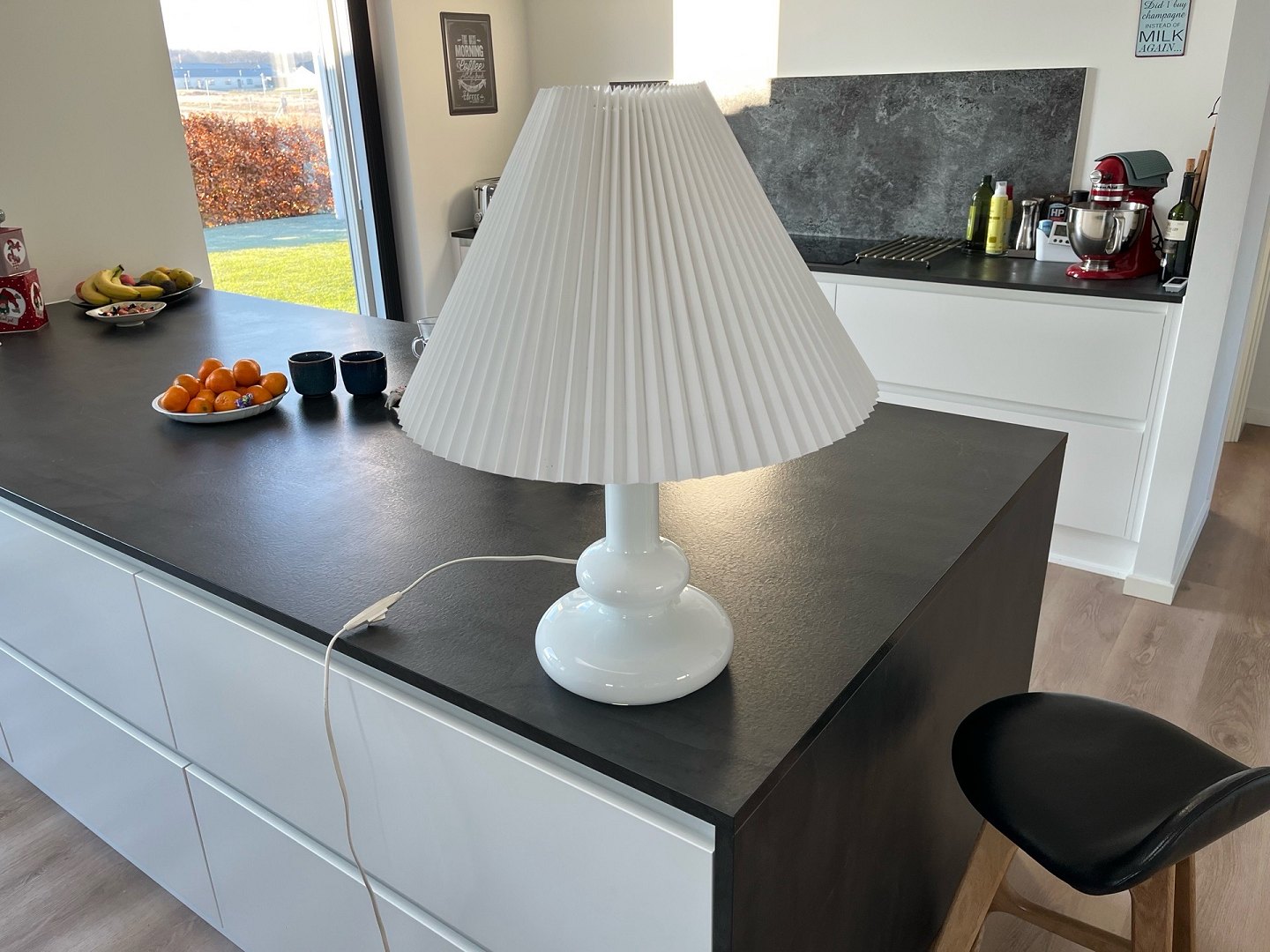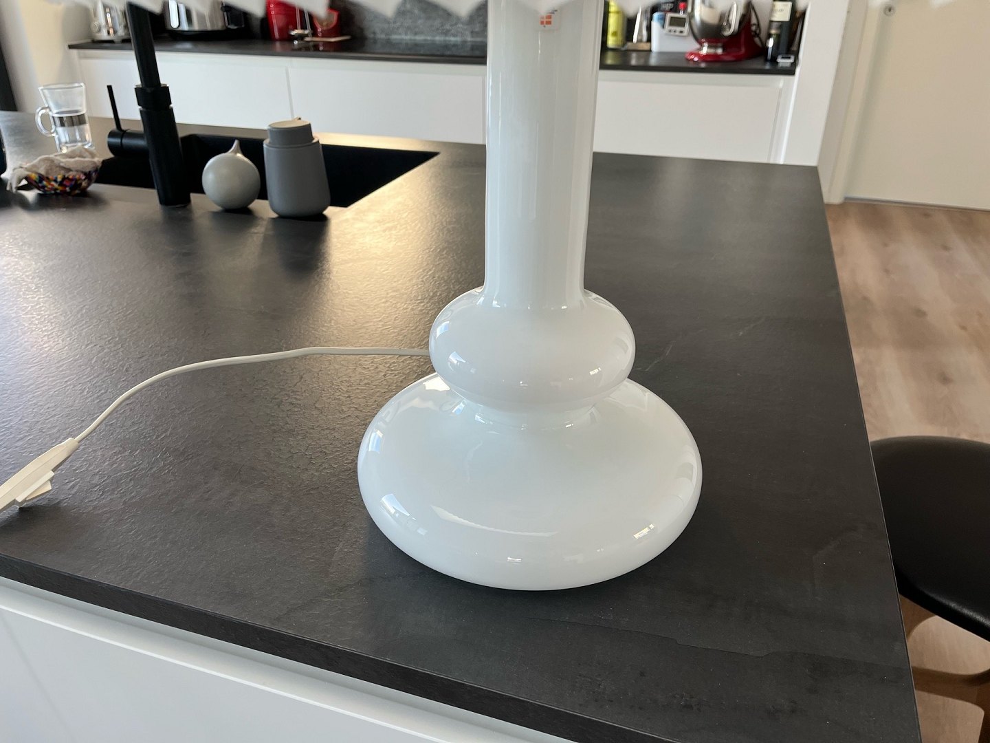 Plaza bordlampe i opalglas, fremstillet ved Holmegaard Glasværk, produktionsperiode 1978–1984.