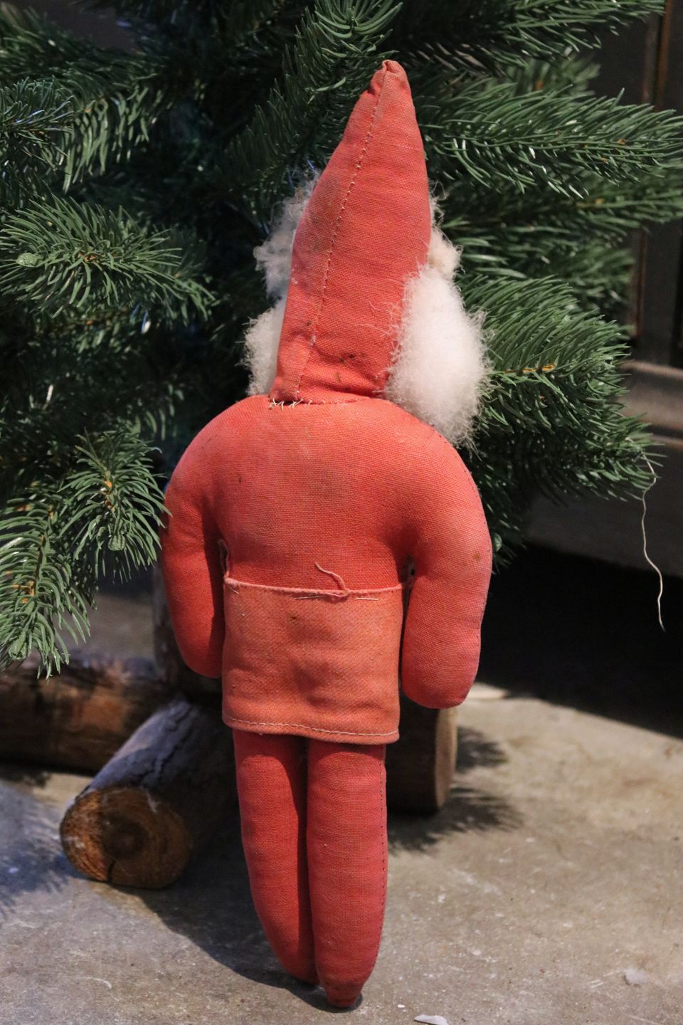 Fin , gammel julemand med krop i rødt stof med bemalet papmache ansigt og skæg af dun...