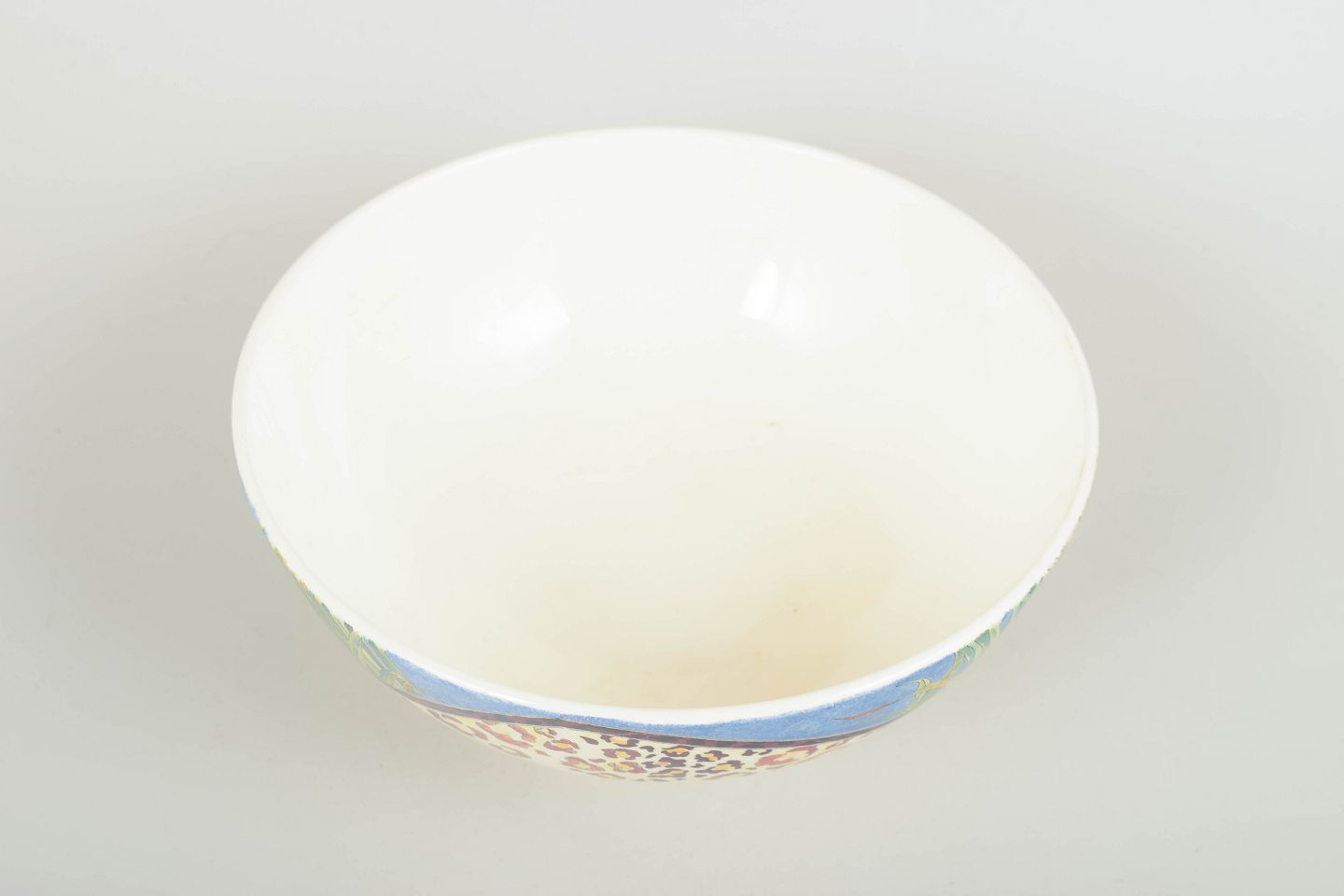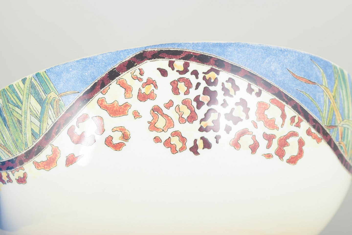 Dekorativ stor skål i porcelæn med farverigt, håndmalet savanne-motiv i blå, grønne og leopardplettede nuancer. Klassisk Gien-fajance i typisk 1980’er-stil.
