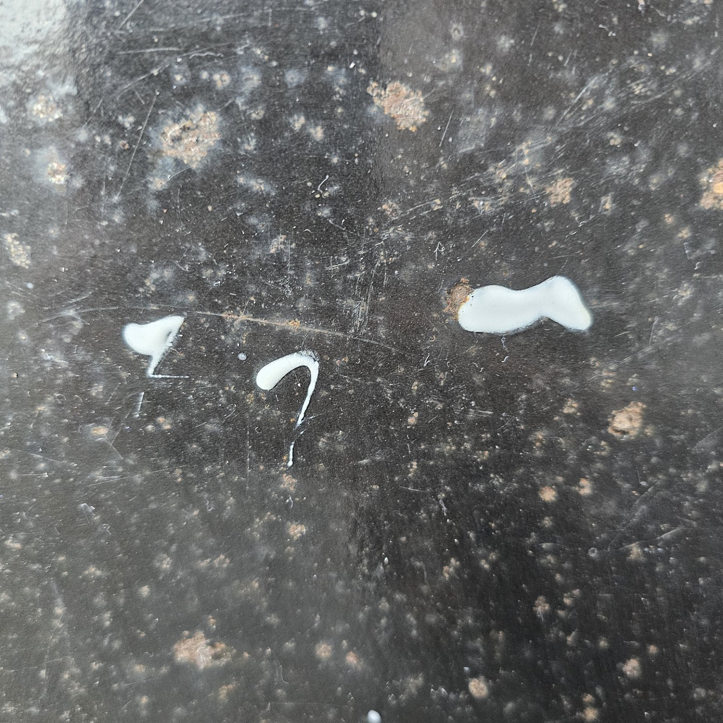 Fremstår med rust og brugsspor på bagsiden og i emaljen, samt klatter af maling på bagsiden