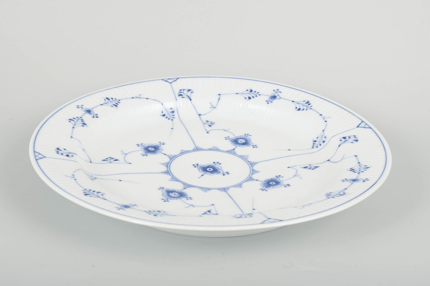 Stort og dekorativt serveringsfad i musselmalet riflet porcelæn, håndmalet i klassisk koboltblå på riflet korpus. Den brede, svungne form og det rige mønster gør fadet til et markant eksempel på Royal Copenhagens produktion i 1920’erne.