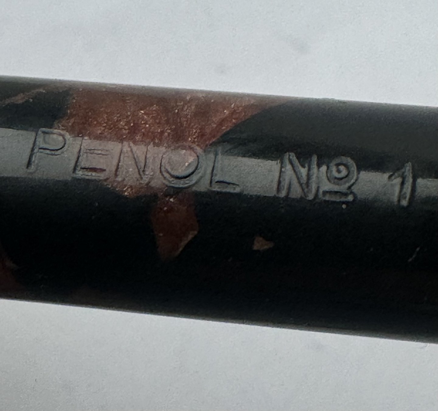Sort og rød-brun marmoreret Penol. nr. 1 fyldepen. Fremstår i god stand uden skader eller reparationer. Fungerer ikke. Der skal indsættes en ny gummisæk før en fyldepennen igen kan optage blæk og skrive igen. Forenden end original Penol 14 karat guldspids. Længde:11,2 cm