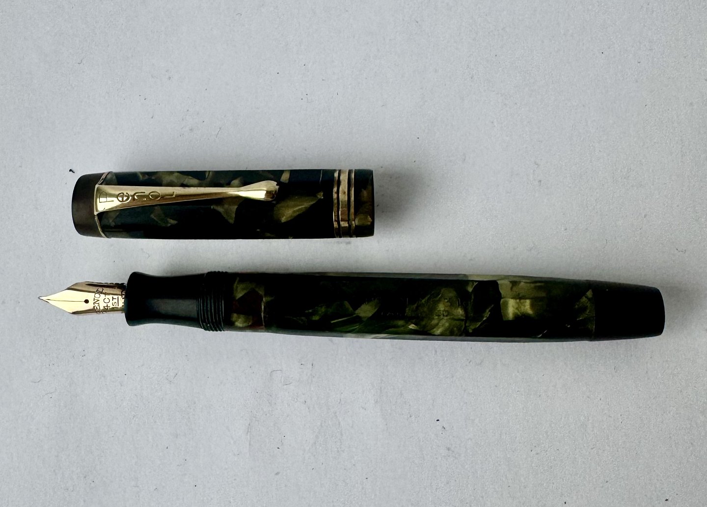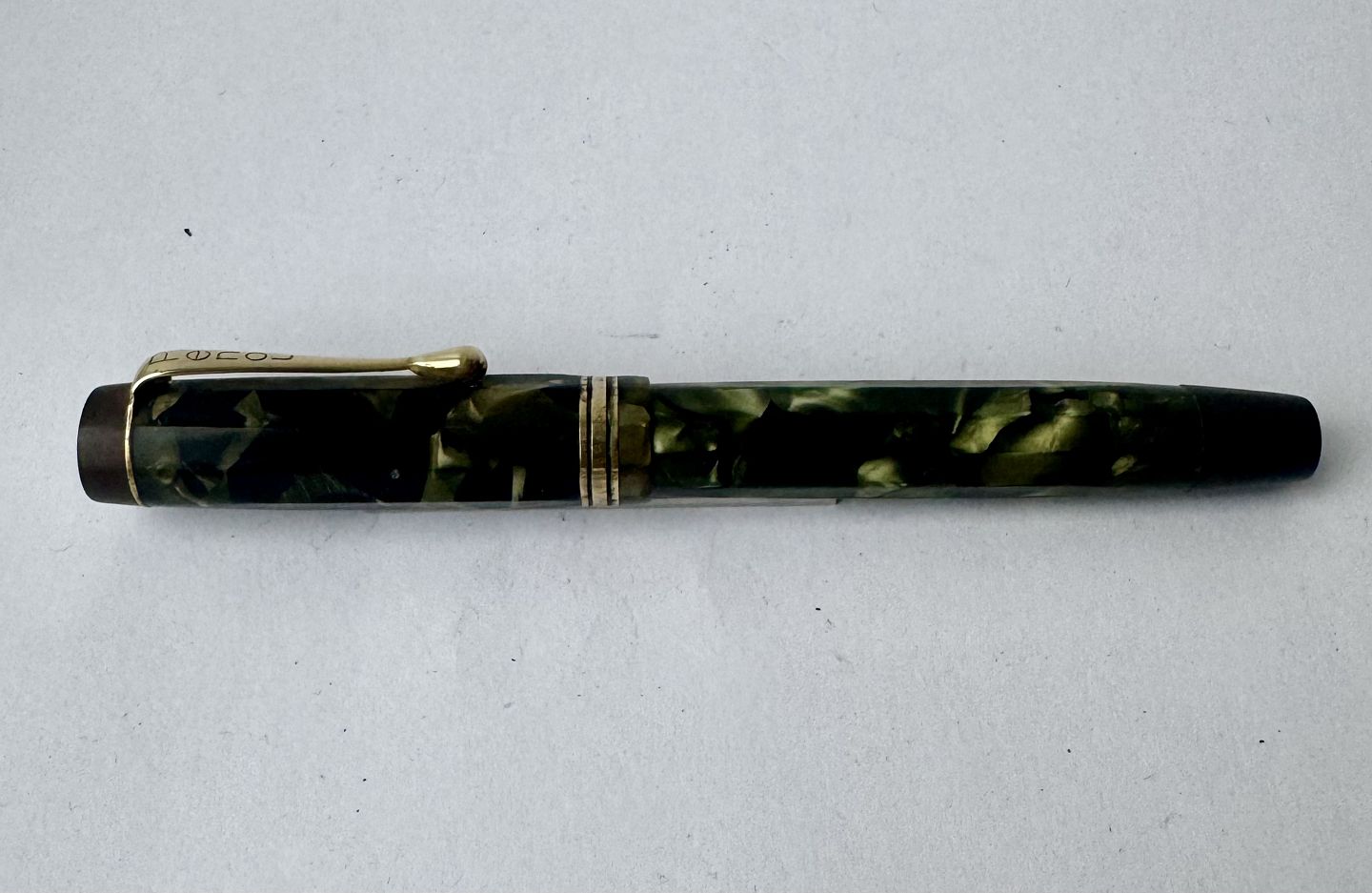 10-kantet og grønt marmoreret Penol 3k fyldepen. Fremstår i god stand med alle originale Penol dele. Inklusiv en 14 karat guldspids. Der skal indsættes ny gummisæk, så pennen igen kan optage blæk og skrive igen. Længde: 13,3 cm.