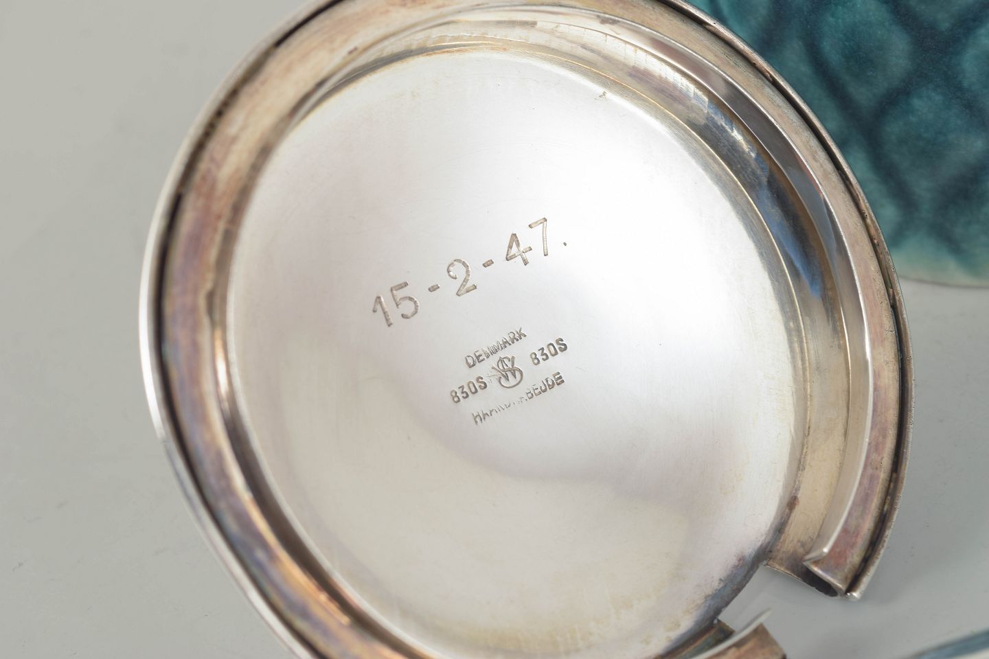 Marmeladekrukke med tretårnet låg og tretårnet sølvske, midt 1900-tallet.
