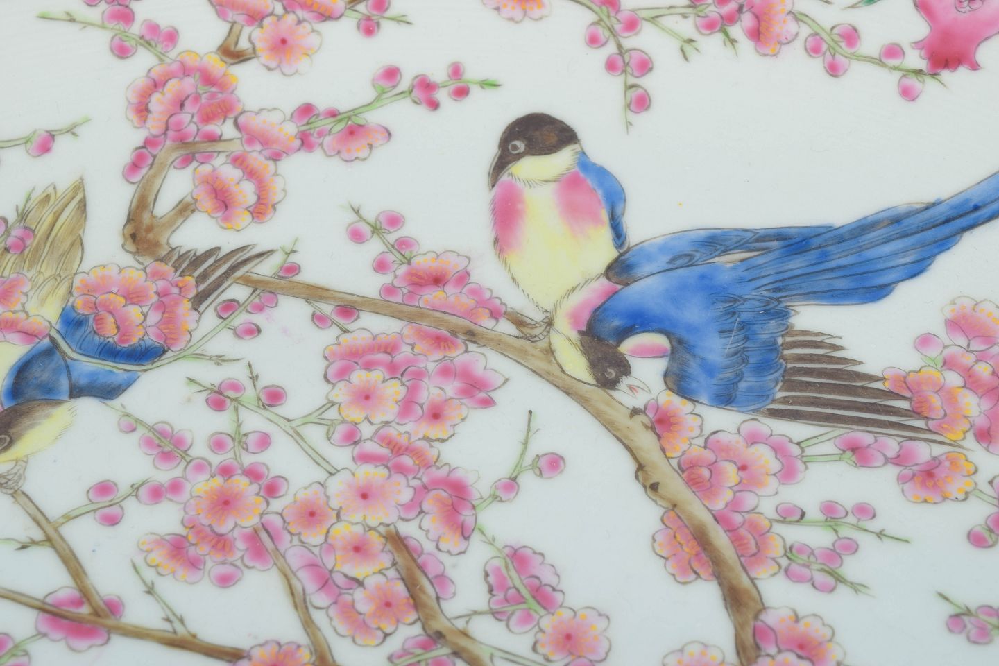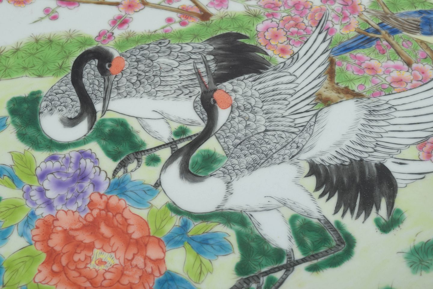 Kinesisk porcelæn fra det 20. århundrede spænder fra traditionelle motiver til mere dekorative værker fremstillet til både hjemmemarkedet og eksport. De håndmalede fade med fugle- og blomsterdekorationer er særligt værdsatte for deres detaljerigdom, farver og symbolske betydning. Motiver som traner, blomstrende træer og solen forbindes ofte med lykke, harmoni og lang levetid.