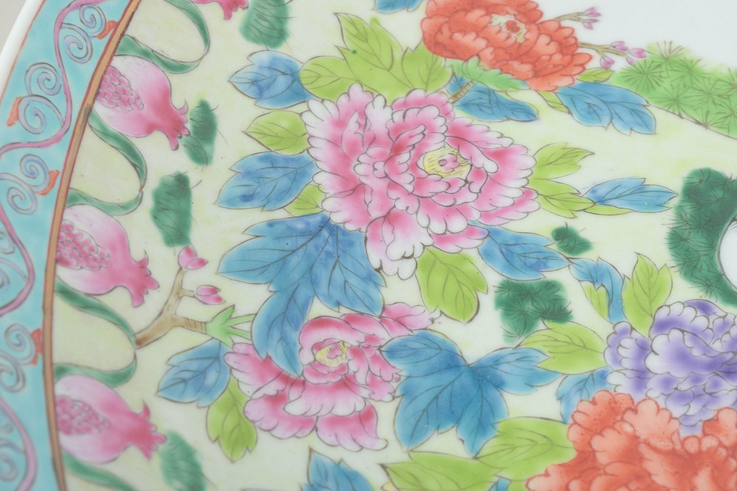 Monumentalt kinesisk fad i porcelæn, rigt håndmalet med farvestrålende fugle, blomstrende træer, traner og solmotiv. Et dekorativt og imponerende stykke med stærk visuel tilstedeværelse.