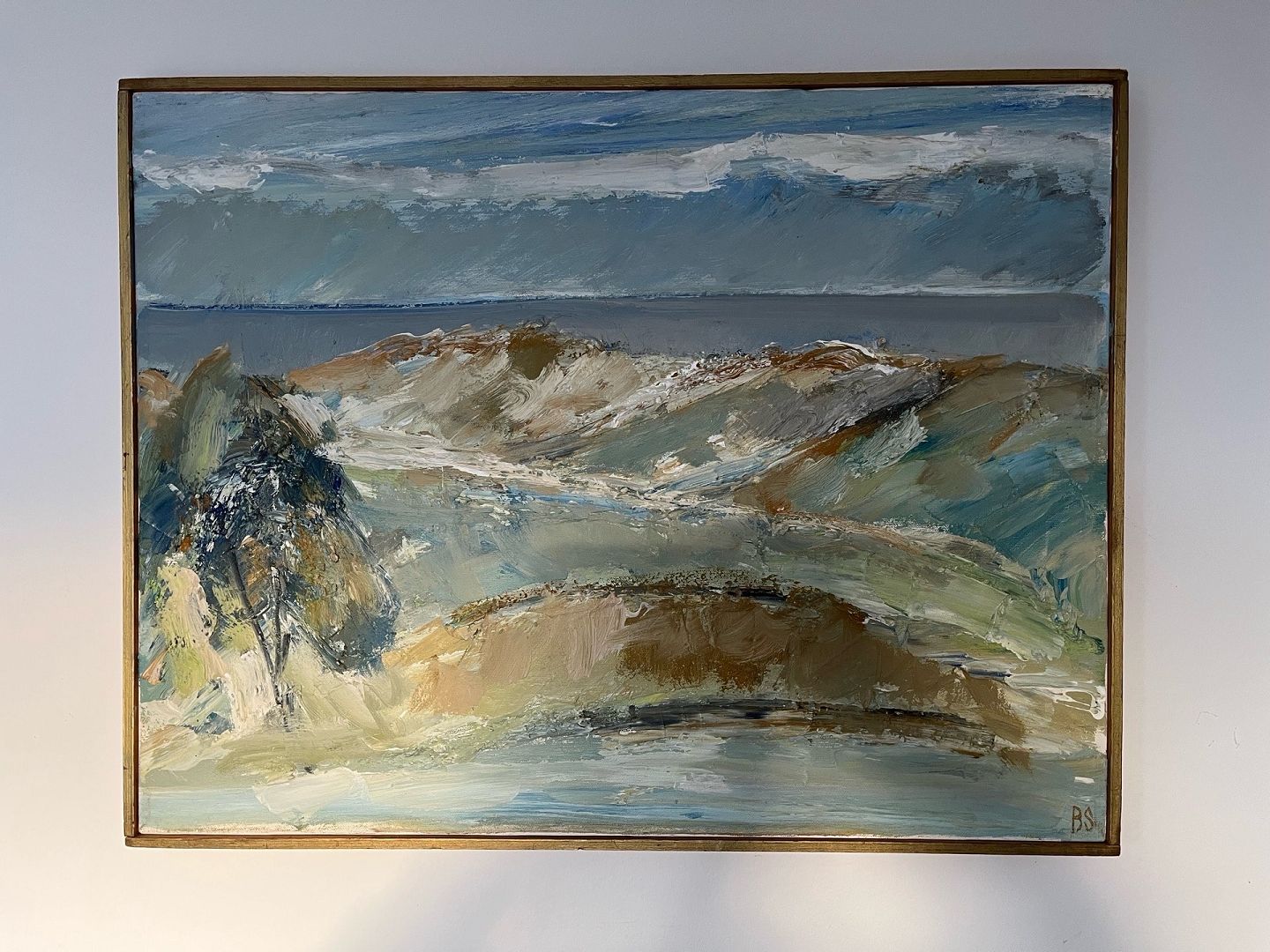 Motiv: Detaljerne i maleriet, især i den venstre del, antyder muligvis en abstrakt kvindelig figur eller en fortolkning af kystlinjer/bølger, hvilket er almindelige motiver i lignende kunst.