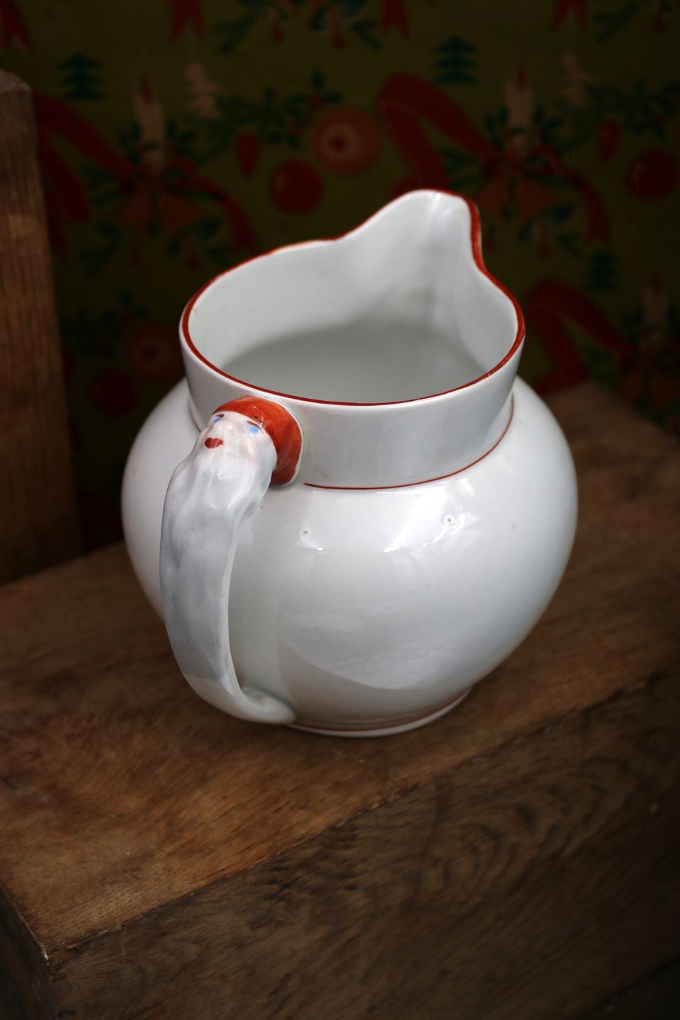 Gammel svensk julekande i fajance med nisser på hældetuden og på hanken. H:12m. Dia.: 13,5cm.