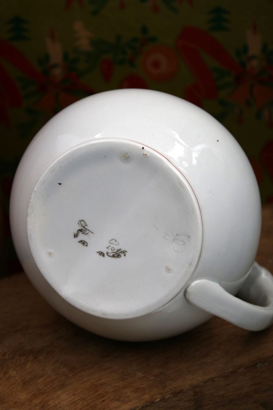 Gammel svensk julekande i fajance med nisser på hældetuden og på hanken...