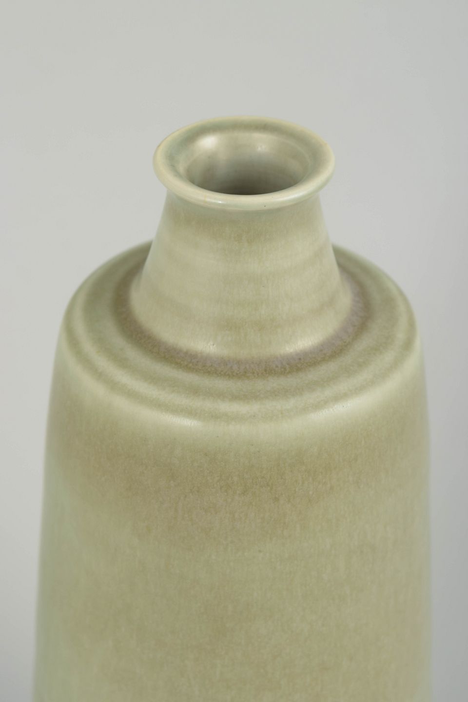 Elegant cylindrisk vase i stentøj med den karakteristiske harepels-glasur i bløde beige- og cremenuancer. Den matte, let levende overflade og den slanke form er typisk for Søholms produktion i 1970’erne.