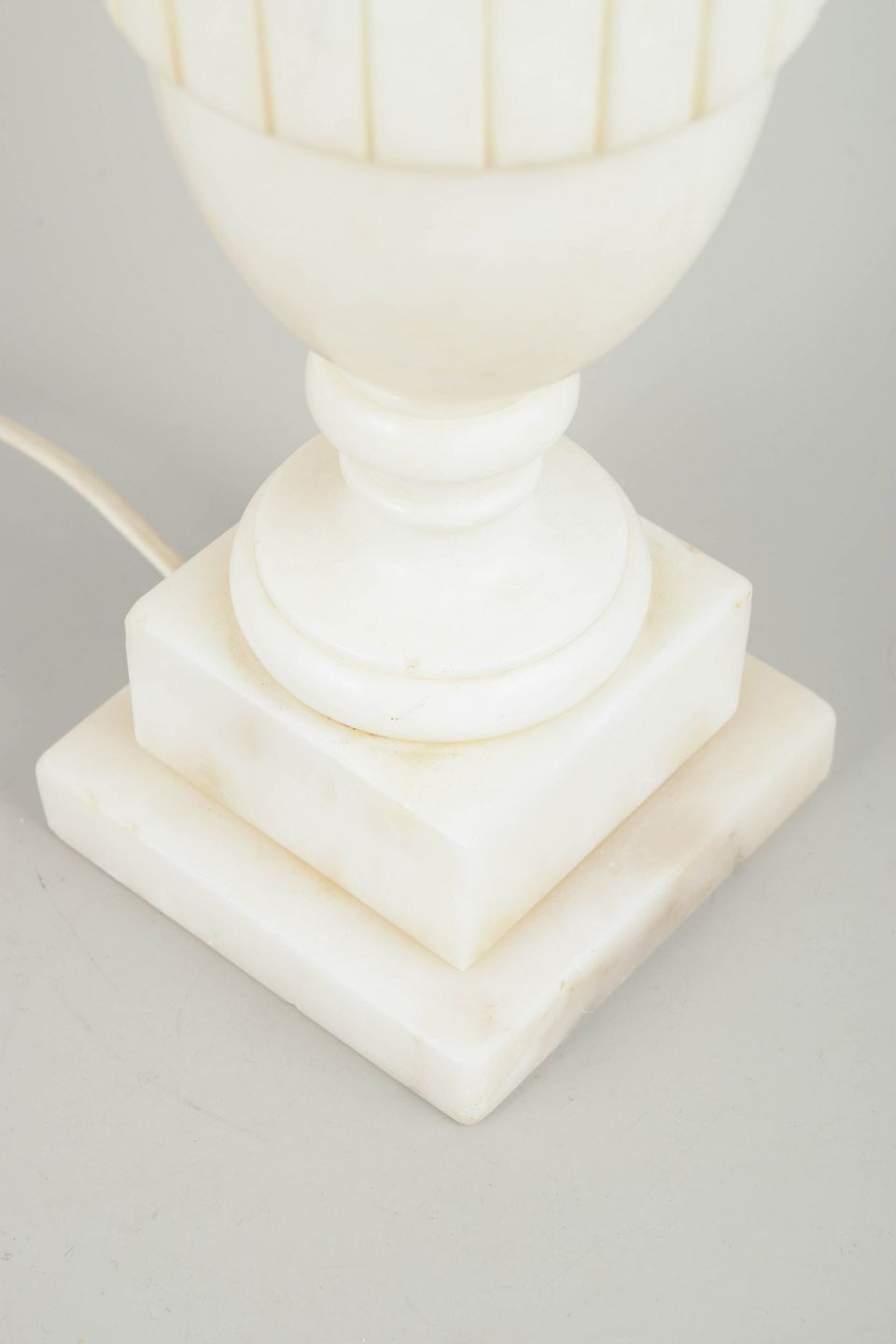Klassisk formet bordlampe i hvid marmor med tydeligt profileret topstykke og vertikale riller på midterpartiet. Den enkle balusterform og den kvadratiske fod giver lampen et harmonisk og tidløst udtryk.