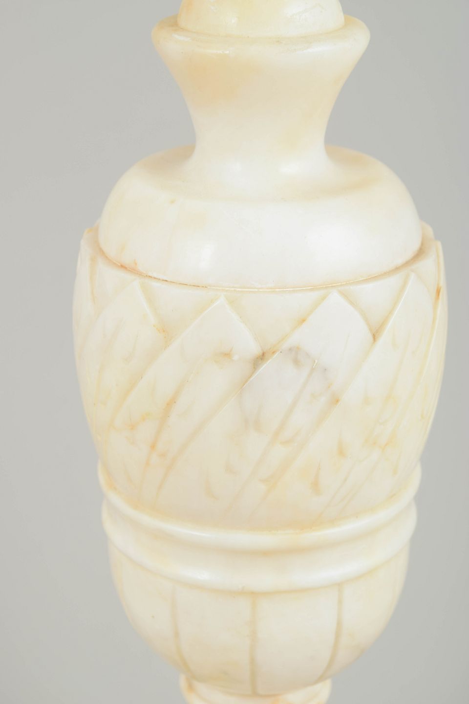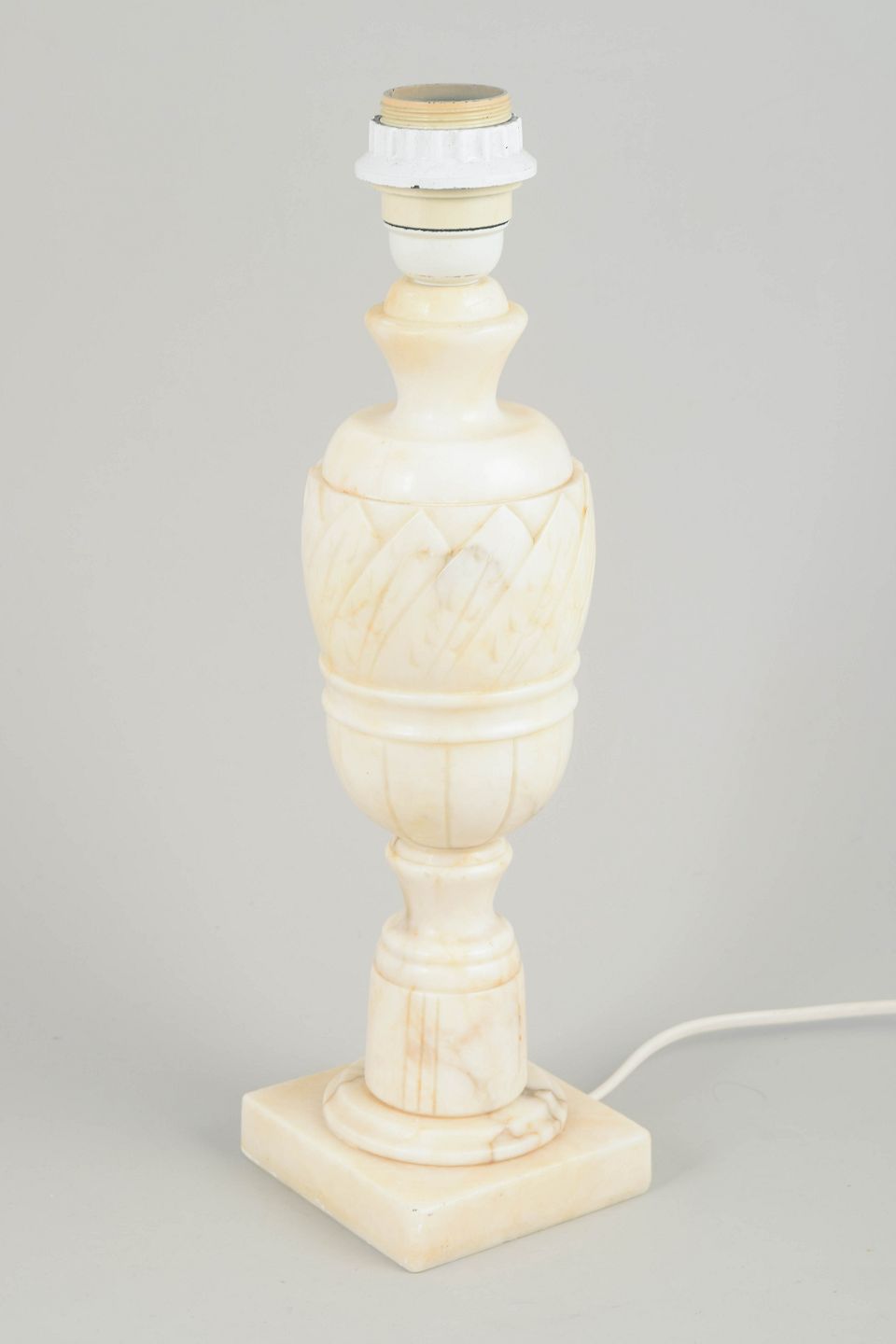 Dekorativ bordlampe i lys marmor med udskårne diamant- og lodrette facetmønstre, der giver lampen et klassisk og elegant formsprog. Den kvadratiske fod og de bløde proportioner understreger lampens skulpturelle karakter.