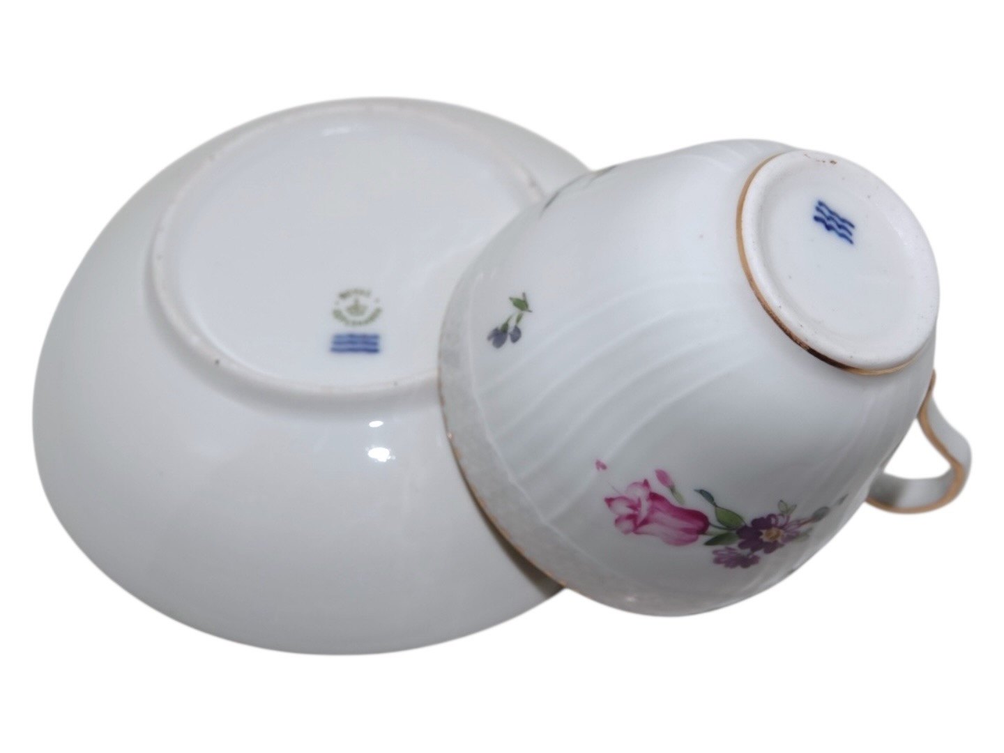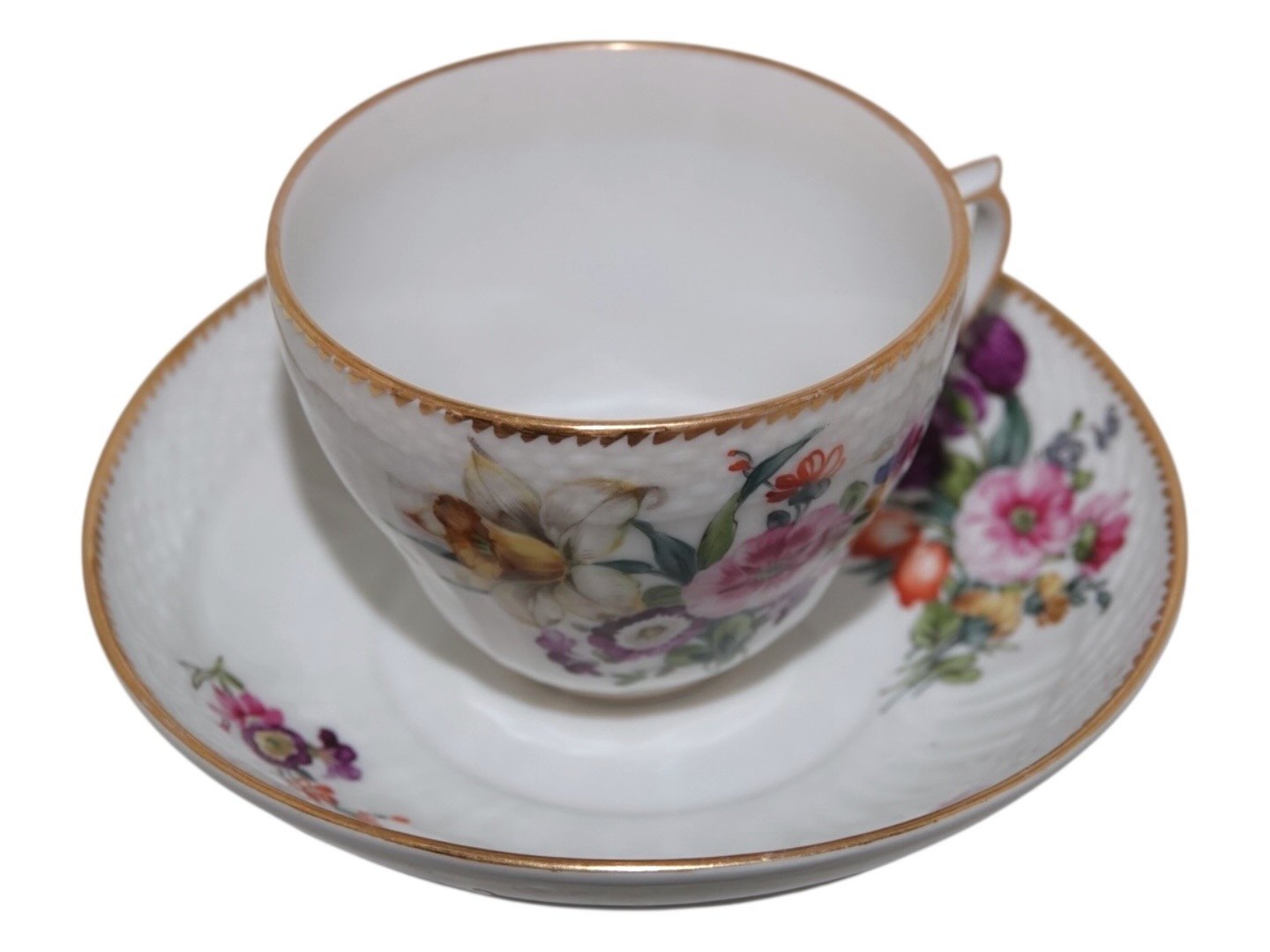 Royal Copenhagen Full Saxon Flower, large coffeecup with matching saucer.