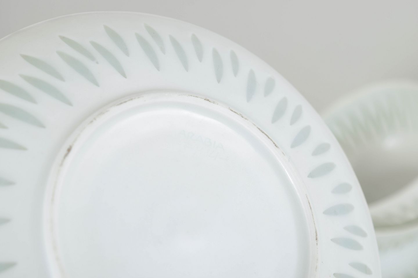 Sæt bestående af tre tekopper med tilhørende underkopper i hvidt porcelæn med gennembrudt “rice porcelain”-dekoration. De aflange perforeringer udfyldt med transparent glasur giver porcelænet et let og næsten translucent udtryk, mens de enkle, afrundede former er karakteristiske for Friedl Holzer-Kjellbergs sene modernistiske porcelænsdesign for Arabia.