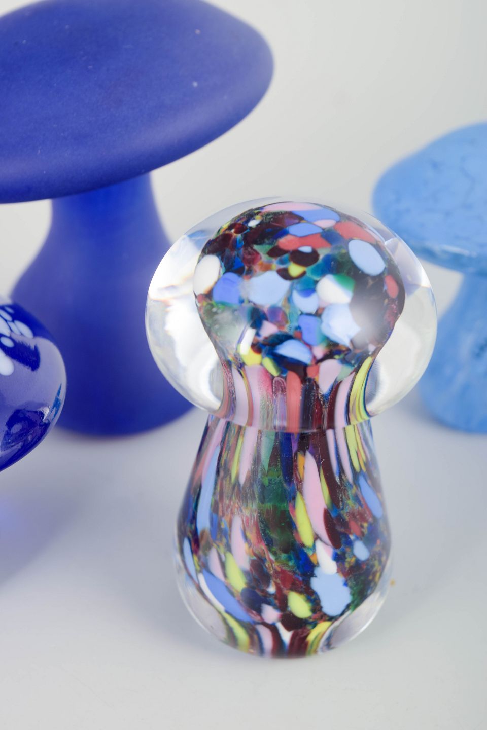 Dekorativ gruppe af svampe i kunstglas i varierende former og farver, herunder dybblå, lyseblå og flerfarvet glas. Organiske silhuetter med markant fokus på farvespil og overfladeeffekter. Mærkat forekommer på nogle eksemplarer.
