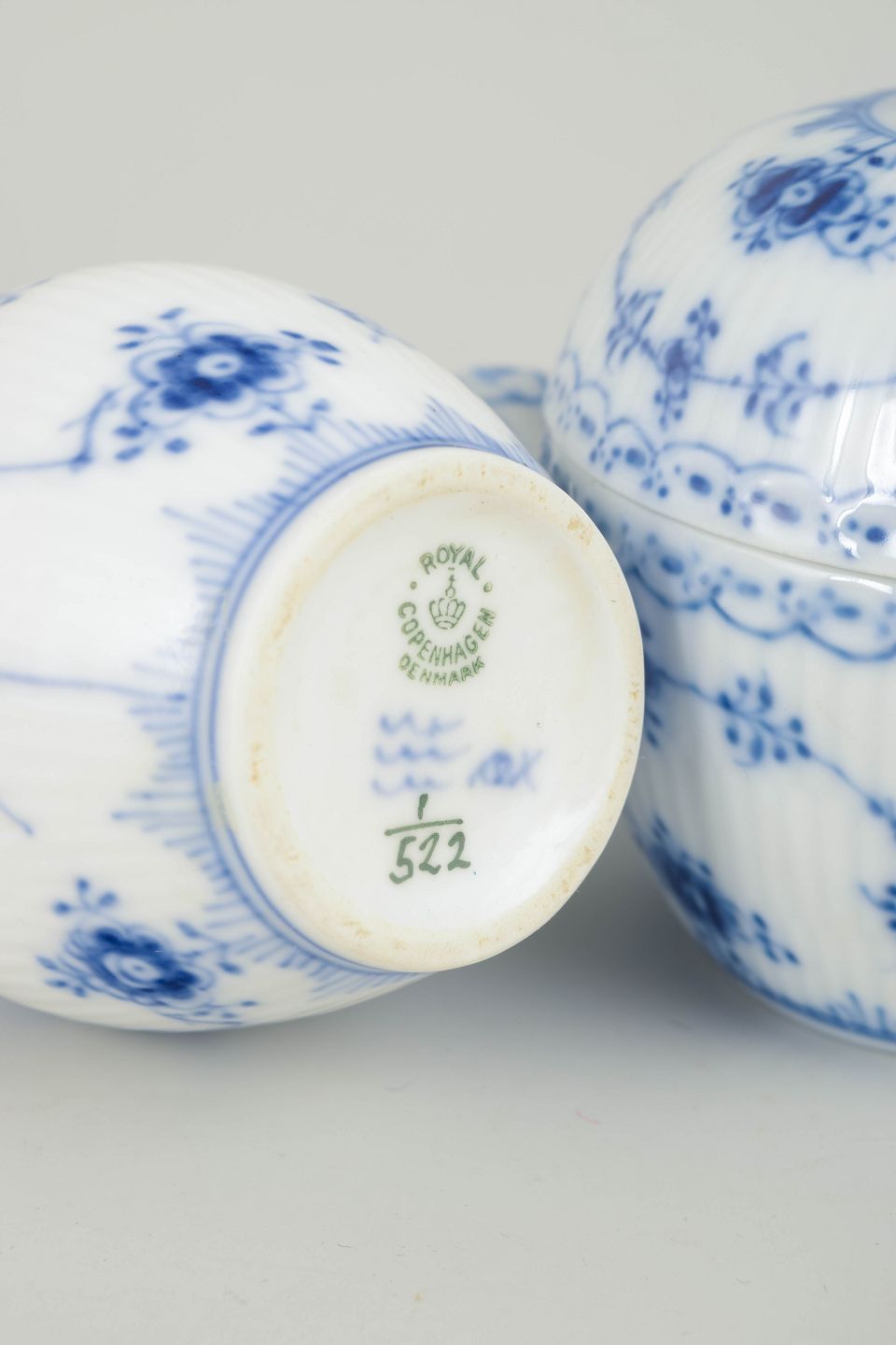 Musselmalet halvblonde blev introduceret i 1885 som en mere dekorativ videreudvikling af det klassiske Blue Fluted Plain stel. De riflede former kombineret med gennembrudt blondekant og håndmalet dekoration har gjort stellet til et af Royal Copenhagens mest elskede gennem generationer. Produktionen i det sene 1900-tal fastholder samme høje håndværksmæssige kvalitet og gør sættet velegnet både til daglig brug og som supplement til ældre dele.