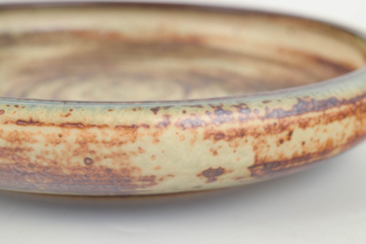 Stor, lav skål udført i stentøj med markant koncentrisk dekoration og levende, krakeleret glasur i lyse sandfarver kombineret med mørkebrune og grå nuancer. Den cirkulære opbygning og det tydelige spil i glasuren giver et stærkt grafisk og samtidig organisk udtryk, karakteristisk for Royal Copenhagens stentøjsproduktion i perioden.