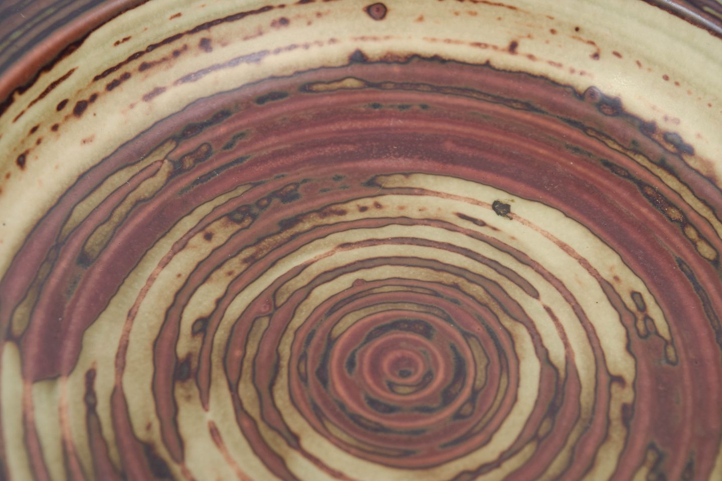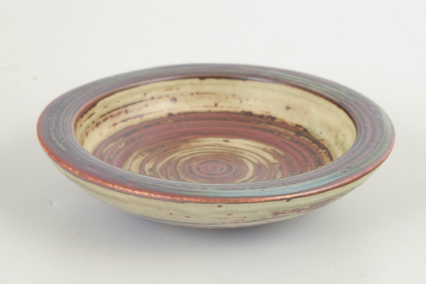 Lav skål udført i stentøj med markant koncentrisk dekoration og levende glasur i varme jordfarver kombineret med grønne og brunlige nuancer. De tydelige drejespor og den cirkulære opbygning skaber et grafisk og samtidig organisk udtryk, karakteristisk for Royal Copenhagens stentøjsproduktion.