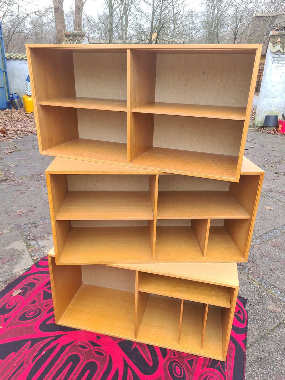 3 bogkasser i finéret eg og med hessian beklædt bagbeklædning. Ydført hos HG Funiture i 1970'erne. Fremstår pæne og velholdte uden de store brugsspor.