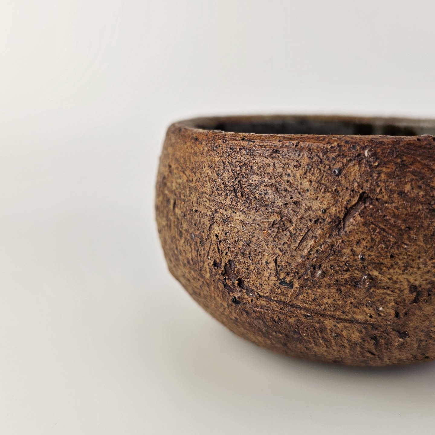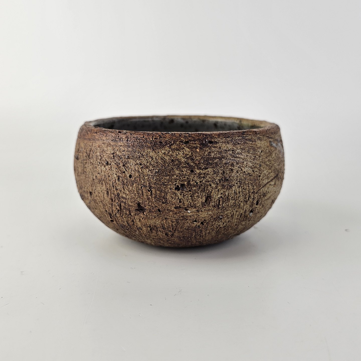 Lille keramik skål der er uglasseret udvendigt, og stribet mønster indvendigt