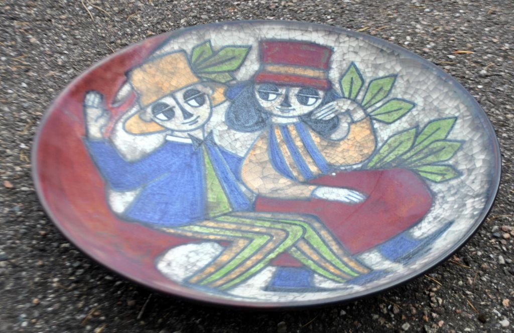 Michael Andersen & Søn keramik fad nr. 4106-2, 20. årh. Bornholm, Danmark. Fad af glaseret keramik dekoreret med personer og krakelé glasur. Stemplet med de tre sild fra Rønnes bytegn. H: 8 cm. Dia: 35,5 cm.
