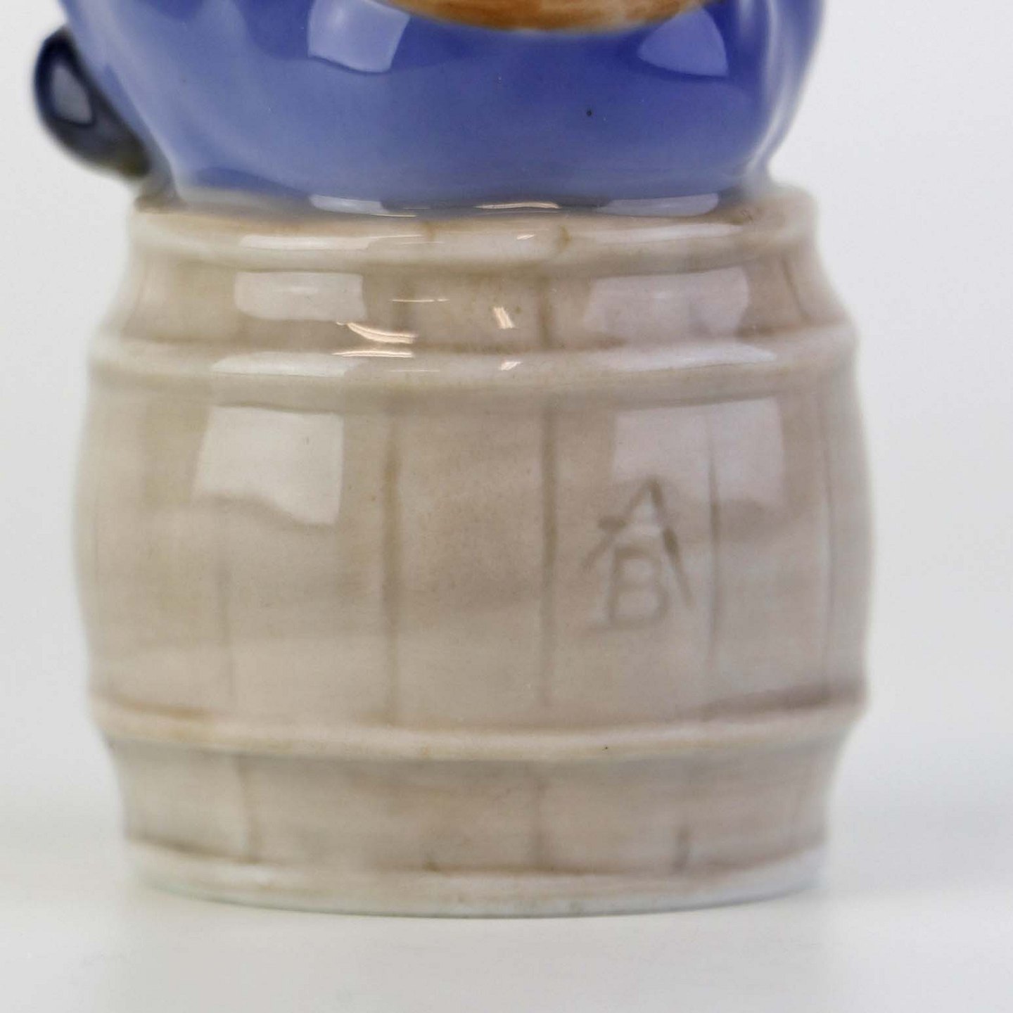 Figur i porcelæn med motiv af siddende dreng på tønde blæsende på et horn. Nr. 3689