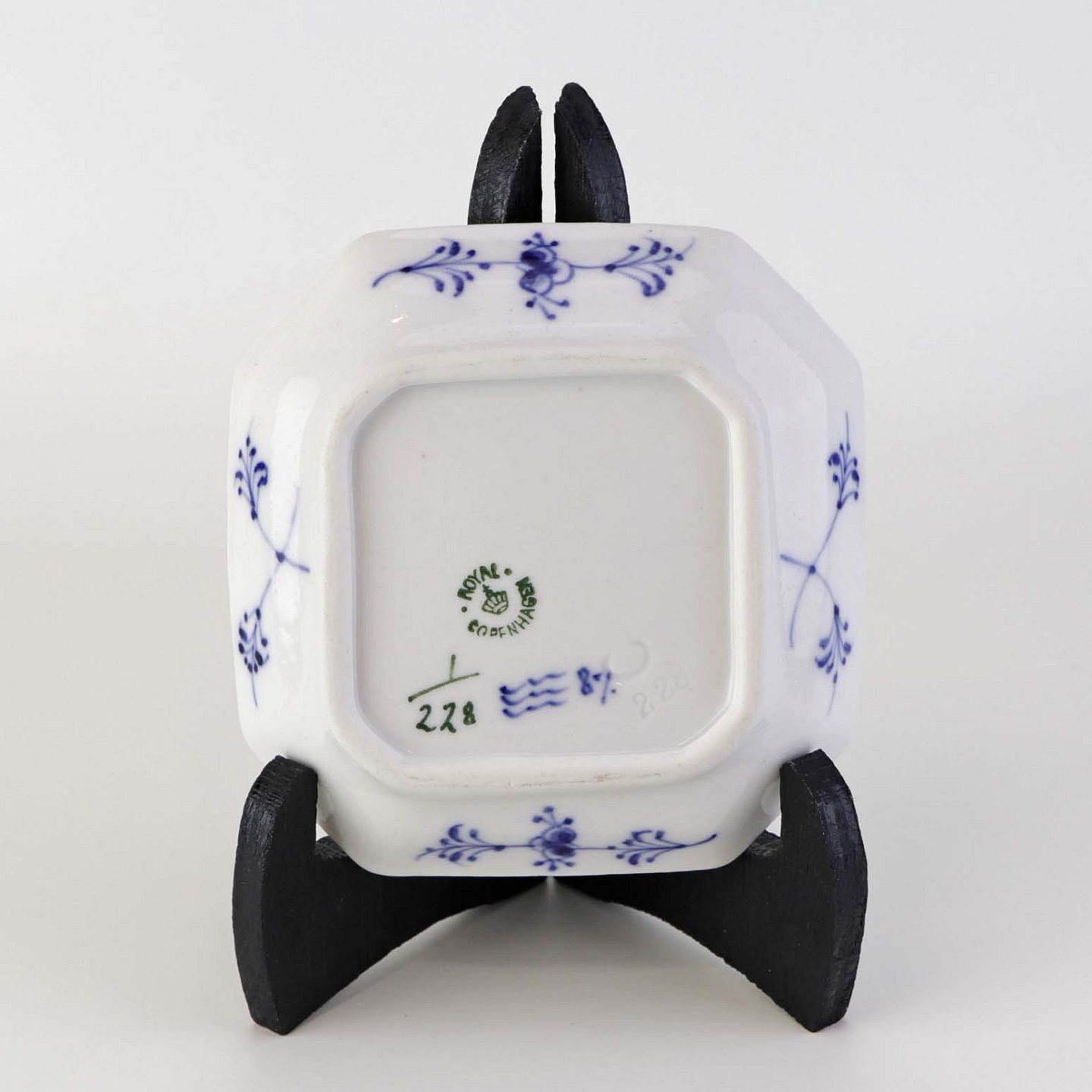 Musselmalet er af kongeligt hvidt porcelæn, dekoreret med rifler og mønster af blå ranker og blomster.