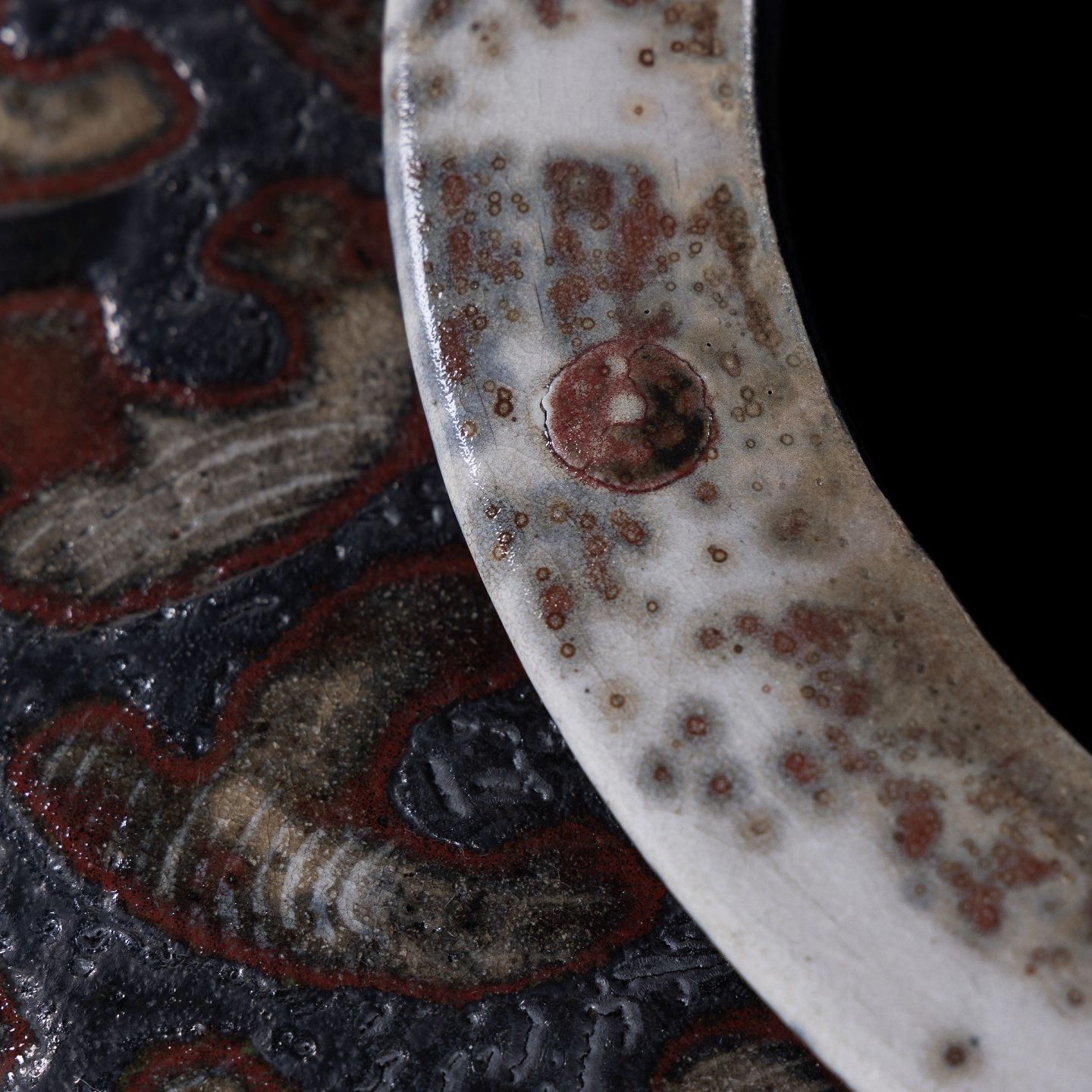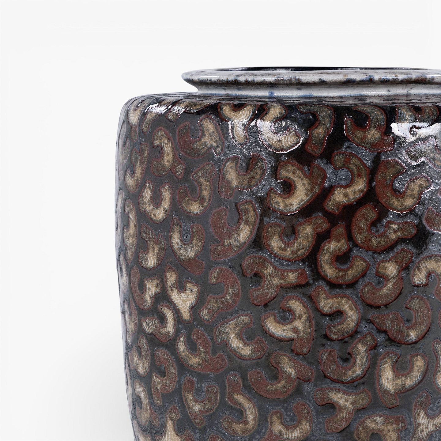 Kolossal krukke i stentøj med sort glasur og røde stafferinger. Signeret.